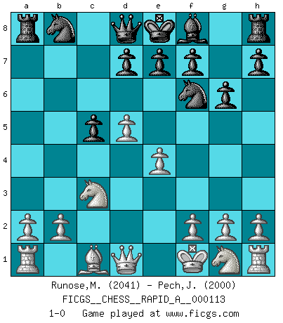 Last move : 1-0 2011 November 20 1:18:41 [Event "FICGS__CHESS__RAPID_A__000113"] [Site "FICGS"] [Date "2011.08.26"] [Round "1"] [White "Runose,Michael"] [Black "Pech,Jaroslav senior"] [Result "1-0"] [WhiteElo "2041"] [BlackElo "2000"] 1.d4 Nf6 2.c4 c5 3.d5 b5 4.cxb5 a6 5.bxa6 Bxa6 6.Nc3 g6 7.e4 Bxf1 8.Kxf1 1-0 This chess game has been lost on time (started : 2011.08.26 17:1:14) Benko gambit accepted Player White won this chess game. Follow this game move after move (download)It is peculiar but a fact nevertheless, that gamblers in chess always have enthusiastic followers. (Botvinnik) Ich verachte Kasparow. (Viktor Kortschnoi) El Ajedrez es una guerra en un tablero. El objetivo es aplastar la mente del oponente. (Bobby Fischer) Si je n'étais pas joueur d'échecs, je serais le meilleur dans quelque chose d'autre. (Anatoli Karpov) Men should grow up. - Yeah. And dogs should stop licking themselves. It's not gonna happen. (Gregory House to Dr. Cameron, House M.D.)