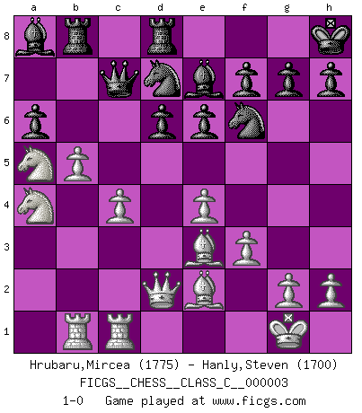 Last move : 1-0 2006 September 14 0:45:16 [Event "FICGS__CHESS__CLASS_C__000003"] [Site "FICGS"] [Date "2006.05.06"] [Round "1"] [White "Hrubaru,Mircea"] [Black "Hanly,Steven"] [Result "1-0"] [WhiteElo "1775"] [BlackElo "1700"] 1.e4 c5 2.Nf3 d6 3.d4 cxd4 4.Nxd4 Nf6 5.f3 a6 6.c4 e6 7.Nc3 Be7 8.Be3 O-O 9.Be2 b6 10.O-O Bb7 11.Qd2 Nbd7 12.a4 Qc7 13.a5 bxa5 14.Nb3 a4 15.Nxa4 Rac8 16.Na5 Ba8 17.b4 Rfd8 18.Rfc1 Rb8 19.Rab1 Kh8 20.b5 1-0 This chess game has been lost on time (started : 2006.05.06 12:23:53) Sicilian : Prins (Moscow) variation Kingside Castling by player Black (move 8) Kingside Castling by player White (move 10) Player White won this chess game. Follow this game move after move (download)A man without frontiers. He didn't divide the East and the West, he brought them together in their admiration for him. (Ljubomir Ljubojevic, about Bobby Fischer's death) Privat ist Kortschnoi kein schlechter Mensch, sehr sympathisch. Aber während des Spiels ist er grausam. Er will dich töten. (Miguel Najdorf) El tablero es el mundo, las piezas es el fenomeno del universo, las reglas del juego son lo que llamamos leyes de la naturaleza y el jugador del lado opuesto, se encuentra oculto a nuestra vista. (Thomas Huxley) Les échecs, c'est la lutte contre l'erreur. (Johannes Zukertort) Horse racing is animated roulette. (Roger Kahn)