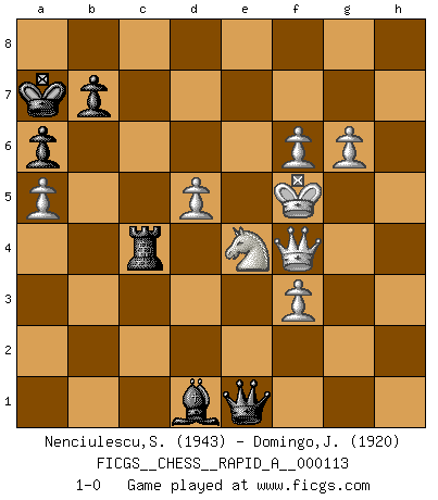 Last move : 1-0 2012 January 10 17:51:22 [Event "FICGS__CHESS__RAPID_A__000113"] [Site "FICGS"] [Date "2011.08.26"] [Round "1"] [White "Nenciulescu,Silviu"] [Black "Domingo,Jordi"] [Result "1-0"] [WhiteElo "1943"] [BlackElo "1920"] 1.d4 h6 2.c4 g5 3.Nc3 Bg7 4.e4 c5 5.d5 d6 6.Bd3 Nd7 7.h4 gxh4 8.Nf3 Ne5 9.Nxe5 Bxe5 10.Rxh4 Bd7 11.Qe2 Qb6 12.a4 a6 13.Bf4 Nf6 14.a5 Qc7 15.Bxe5 dxe5 16.Qd2 O-O-O 17.Nd1 Kb8 18.b4 Ne8 19.Ne3 Nd6 20.Ke2 Rc8 21.Rah1 Rhg8 22.Rxh6 f5 23.bxc5 Qxc5 24.Rxd6 exd6 25.exf5 Rh8 26.Rb1 Rc7 27.Qc3 Be8 28.g4 Rh2 29.Qb4 Qd4 30.Qxd6 e4 31.Bxe4 Qxe4 32.Qxh2 Qxb1 33.Qe5 Ba4 34.g5 Qh1 35.g6 Qg1 36.f3 Qg5 37.Kf1 Qh6 38.Ng4 Qg5 39.Nf6 Qd2 40.Ne4 Qd3+ 41.Kg2 Qe2+ 42.Kg3 Bd1 43.Qf4 Ka7 44.f6 Qe1+ 45.Kg4 Rxc4 46.Kf5 1-0 This chess game has been lost on time (started : 2011.08.26 17:1:14) Queen's pawn Queenside Castling by player Black (move 16) Player White won this chess game. Follow this game move after move (download)A thorough understanding of the typical mating continuations makes the most complicated sacrificial combinations leading up to them not only not difficult, but almost a matter of course. (Siegbert Tarrasch) Bogoljubow: Matt in vier Zügen! Tartakower: Ich verbitte mir jede Belästigung! (Savielly Grigorievitsch Tartakower) Muchos se han convertido en Maestros de Ajedrez, nadie se ha convertido en el Maestro del Ajedrez. (Siegbert Tarrasch) On peut tirer plus d'utilité d'une partie perdue que de 100 parties gagnées. (Capablanca) When you stop learning you start dying. (M. Scott Adams)