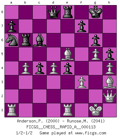 Last move : 1/2-1/2 2011 September 14 16:44:33 [Event "FICGS__CHESS__RAPID_A__000113"] [Site "FICGS"] [Date "2011.08.26"] [Round "1"] [White "Anderson,Peter W."] [Black "Runose,Michael"] [Result "1/2-1/2"] [WhiteElo "2000"] [BlackElo "2041"] 1.d4 Nf6 2.c4 e6 3.Nc3 Bb4 4.e3 O-O 5.Bd3 d5 6.Nf3 c5 7.O-O Nc6 8.a3 Bxc3 9.bxc3 b6 10.cxd5 exd5 11.Ne5 Bb7 12.f3 Re8 13.Nxc6 Bxc6 14.a4 Qc7 15.Qe1 Qd7 16.Bc2 Qc7 17.Bd2 Rac8 18.Qh4 h6 19.Rfb1 Qe7 20.a5 b5 21.a6 c4 22.Re1 Rb8 23.Qg3 Nh5 24.Qf2 Nf6 25.g4 Rb6 26.h4 Qd7 27.Qh2 h5 28.Bf5 Qd8 29.g5 Nd7 30.e4 g6 31.Bh3 Nb8 32.Bf4 Nxa6 33.Be5 b4 34.cxb4 dxe4 1/2-1/2 Nimzo-Indian : 4.e3 O-O, 5.Bd3 d5 Kingside Castling by player Black (move 4) Kingside Castling by player White (move 7) This chess game ended in a draw. Follow this game move after move (download)Castle early and often. (Rob Sillars) Frage: Wie viele Autos haben Sie schon zerstört? - Antwort: Nur zwei. (Loek van Wely) El Rey es una pieza de pelea. ¡Usenlo!. (Wilhelm Steinitz) Un journaliste : 'Vous préférez avoir une dame de plus sur l'échiquier ou au lit ?' Boris Spassky : 'Ca dépend de la position.' Somehow our devils are never quite what we expect when we meet them face to face. (Nelson DeMille)