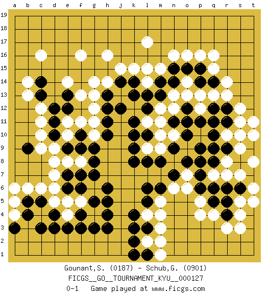 Last move : 0-1 2011 October 13 17:13:29 [Event "FICGS__GO__TOURNAMENT_KYU__000127"] [Site "FICGS"] [Date "2011.08.27"] [Round "1"] [Black "Gounant,Stanislas"] [White "Schub,Guillaume"] [Result "0-1"] [Rating 1 "0187"] [Rating 2 "0901"] 1.d3 q16 2.r4 c16 3.d10 c12 4.q10 p4 5.k4 r3 6.q5 q4 7.r5 p5 8.p6 o6 9.p7 m3 10.l3 m4 11.l6 d5 12.c5 c6 13.d4 e5 14.b5 b6 15.b9 e8 16.e7 d7 17.f7 f8 18.g7 d9 19.e9 e10 20.f9 c10 21.g8 d8 22.d11 c11 23.f10 e11 24.d12 f11 25.e12 g11 26.g9 g13 27.e13 f16 28.h11 f13 29.h12 r14 30.e6 d6 31.h10 e14 32.n7 l17 33.j14 h16 34.k9 l14 35.l13 k15 36.k14 j15 37.n14 n16 38.m14 l15 39.o15 o16 40.p15 p16 41.q14 r13 42.r12 q13 43.q12 p13 44.o12 o13 45.m13 p12 46.p11 n12 47.o11 n13 48.n15 m11 49.f4 f5 50.g5 e4 51.e3 g4 52.f3 g6 53.h5 c9 54.l10 m10 55.n9 m9 56.m8 l9 57.l8 l11 58.k10 s4 59.f6 l2 60.k2 m2 61.l1 s5 62.s6 s3 63.q6 t6 64.t7 t5 65.s8 s12 66.r11 a5 67.b4 a4 68.a3 a6 69.c3 l4 70.k3 q15 71.k13 t11 72.n11 m12 73.p14 t10 74.h13 g14 75.k11 o7 76.o8 n6 77.m6 m5 78.l5 m1 79.k1 h14 80.h6 s9 81.r9 s10 82.h3 n10 83.o10 r10 84.q11 r8 85.q8 r7 86.r6 q9 87.p9 s7 88.r9 t8 89.q9 q7 90.p8 m15 91.l12 g12 92.j12 s11 93.c13 b13 94.c14 b14 95.g3 g10 96.h4 o14 97.k8 pass 0-1 Here are the names of the openings (joseki) played in the four corners : Corner q4 : r4 p4 Komoku (Somok, Xiao~mu`) 3-4 Point. The komoku (3-4) point is the traditional corner enclosure move.. Ikken Takagakari (Hankan Nop'dakeolch'im, Yi Gaogua`jiao~, 1-Space High Approach). The 5-4 approach move has become more popular in modern times, as modern Go emphasizes speed and influence. Corner d4 : d3 d5 Komoku (Somok, Xiao~mu`) 3-4 Point. The komoku (3-4) point is the traditional corner enclosure move.. Ikken Takagakari (Hankan Nop'dakeolch'im, Yi Gaogua`jiao~, 1-Space High Approach). The 5-4 approach move has become more popular in modern times, as modern Go emphasizes speed and influence. Player White won this Go (weiqi, baduk) game. Follow this game move after move (download)When your opponent is thick, you must also become thick. (Otake Hideo, 9p) The various flowers seem good to different people. (Chinese proverb)