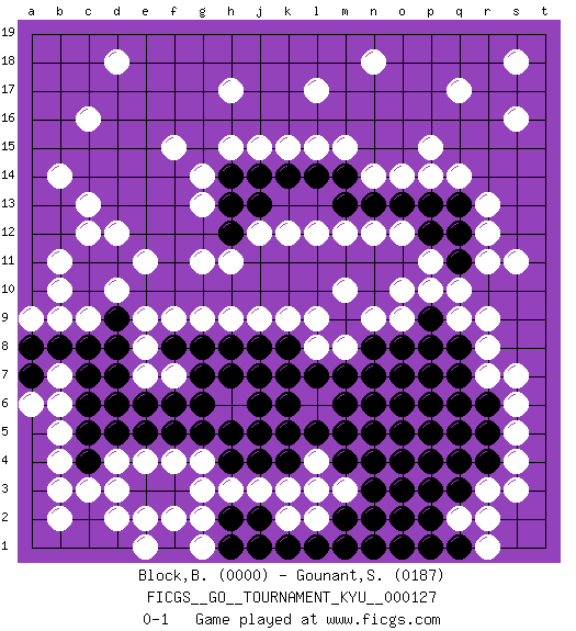Last move : 0-1 2012 January 31 16:9:28 [Event "FICGS__GO__TOURNAMENT_KYU__000127"] [Site "FICGS"] [Date "2011.08.27"] [Round "1"] [Black "Block,Benjamin"] [White "Gounant,Stanislas"] [Result "0-1"] [Rating 1 "0000"] [Rating 2 "0187"] 1.d5 q17 2.p5 c16 3.j5 d10 4.c7 q10 5.p8 o9 6.p7 r8 7.p6 m8 8.o5 k15 9.p9 p10 10.n5 h9 11.k5 q9 12.q8 r13 13.m5 g13 14.l5 l12 15.m7 l9 16.m6 n14 17.k6 h17 18.n7 c13 19.g7 f15 20.j8 j9 21.k8 k9 22.k7 n18 23.o7 s16 24.l7 d18 25.h8 e8 26.e6 g11 27.g8 g9 28.g6 o12 29.h5 p15 30.g5 r7 31.q7 l17 32.c8 c9 33.d7 e7 34.d6 l8 35.n8 n9 36.f6 e9 37.f8 f9 38.b8 b9 39.a8 a9 40.r6 s6 41.r5 s5 42.r4 s4 43.q4 s3 44.p4 r3 45.q3 q2 46.p2 r2 47.q1 r1 48.p1 s7 49.c11 b11 50.d11 e11 51.c10 b10 52.d8 c12 53.d9 d12 54.p3 f7 55.o4 o10 56.j2 s11 57.o3 r9 58.q5 m10 59.o8 c3 60.h7 d2 61.q6 b3 62.o6 b4 63.j7 d3 64.n6 e2 65.j6 b5 66.o2 f2 67.o1 b6 68.c5 b7 69.a7 a6 70.c6 g3 71.c4 h3 72.h2 j3 73.k4 k3 74.k1 k2 75.l1 l2 76.m2 l3 77.m1 m3 78.n3 g2 79.j1 g1 80.h1 d4 81.m4 l4 82.j4 e4 83.h4 g4 84.f5 f4 85.e5 b2 86.n4 b14 87.n2 e1 88.n1 s18 89.j13 j12 90.j14 j15 91.k14 k12 92.l14 l15 93.m14 m15 94.m13 m12 95.h14 h15 96.h13 g14 97.h12 h11 98.n13 n12 99.o13 o14 100.p13 p14 101.p12 p11 102.q12 r12 103.q13 q14 104.q11 r11 0-1 Here are the names of the openings (joseki) played in the four corners : Player White won this Go (weiqi, baduk) game. Follow this game move after move (download)Sacrifice for shape. (Anonymous) The worth of a book is to be measured by what you can carry away from it. (James Bryce)