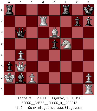 Last move : 1-0 2007 April 8 10:56:46 [Event "FICGS__CHESS__CLASS_A__000012"] [Site "FICGS"] [Date "2007.01.02"] [Round "1"] [White "Plante,Marc-Eric"] [Black "Dyakov,Alexander"] [Result "1-0"] [WhiteElo "2021"] [BlackElo "2153"] 1.e4 c5 2.Nf3 d6 3.d4 cxd4 4.Nxd4 Nf6 5.Nc3 a6 6.Be3 e5 7.Nb3 Be6 8.f3 Be7 9.Qd2 O-O 10.O-O-O Nbd7 11.g4 b5 12.g5 b4 13.Ne2 Ne8 14.Ng3 a5 15.Kb1 Nc7 16.f4 a4 17.Nc1 b3 18.f5 bxa2+ 19.Ka1 d5 20.fxe6 fxe6 21.exd5 a3 22.b4 Nxd5 23.Bh3 Kh8 24.Bxe6 Nxe3 25.Qxe3 Bxg5 26.Qb3 Bxc1 27.Rxd7 Bb2+ 28.Kxa2 Qb6 29.Nf5 1-0 Sicilian : Najdorf, Byrne (English) attack Kingside Castling by player Black (move 9) Queenside Castling by player White (move 10) Player White won this chess game. Follow this game move after move (download)I play correspondence chess because it is both art and science while chess is art only. (A player at FICGS) Die jungen Leute sollen verstehen, dass sie noch etwas von mir lernen können und müssen. (Viktor Kortschnoi) Morphy probablemente fue el genio más grande de todos. (Bobby Fischer) Le temps de noter son nom sur la feuille de partie, j'étais déjà en zeitnot ! D'un modeste amateur apparié lors de la première ronde d'un open contre le grand-maître Azmaïparashvili. Man is still the most extraordinary computer of all. (John F. Kennedy)