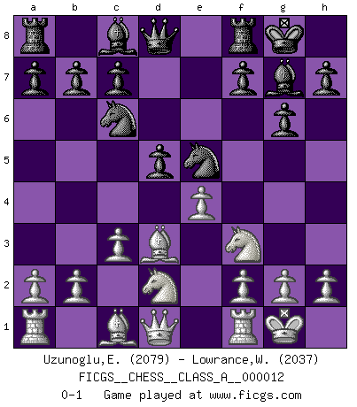 Last move : 0-1 2007 March 3 12:24:29 [Event "FICGS__CHESS__CLASS_A__000012"] [Site "FICGS"] [Date "2007.01.02"] [Round "1"] [White "Uzunoglu,Efe Kerem"] [Black "Lowrance,Wayne"] [Result "0-1"] [WhiteElo "2079"] [BlackElo "2037"] 1.d4 d5 2.Nf3 Nf6 3.e3 g6 4.Bd3 Bg7 5.Nbd2 O-O 6.O-O Nc6 7.c3 e5 8.dxe5 Ng4 9.e4 Ngxe5 0-1 This chess game has been lost on time (started : 2007.01.02 6:35:20) Queen's pawn game Kingside Castling by player Black (move 5) Kingside Castling by player White (move 6) Player Black won this chess game. Follow this game move after move (download)If you aren't afraid of Spassky, then I have removed the element of money. (Jim Slater) Im Schach nämlich geht es darum, daß Ich des Gegners klein zu kriegen, sein Ego zu zerbrechen und zu zermahlen, seine Selbstachtung zu zertreten und zu verscharren und seine ganze mißachtenswerte sogenannte Persönlichkeit ein für alle Mal tot zu hacken und zu zerstampfen und dadurch die menschliche Gesellschaft von einer stinkenden Pestbeule zu befreien. Es ist ein königliches Spiel. (Robert James Fischer) Diferente gente reacciona diferentemente en aceptar la derrota. (Bobby Fischer) Vouloir jouer aux échecs contre soi-même est aussi paradoxal que vouloir marcher sur son ombre. (Stefan Zweig) Indecision is the key to flexibility. (Unknown)