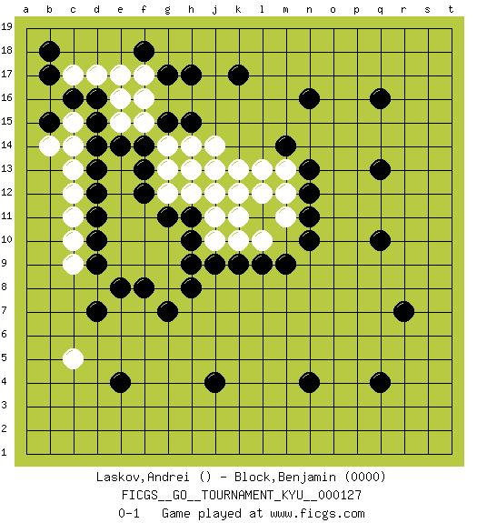 Last move : 0-1 2012 January 17 18:19:23 [Event "FICGS__GO__TOURNAMENT_KYU__000127"] [Site "FICGS"] [Date "2011.08.27"] [Round "1"] [Black "Laskov,Andrei"] [White "Block,Benjamin"] [Result "0-1"] [Rating 2 "0000"] 1.q4 c5 2.d16 c15 3.d15 c14 4.d14 c13 5.d13 c12 6.d12 c11 7.d11 c10 8.q16 d17 9.c16 c17 10.b17 e17 11.g17 e16 12.k17 e15 13.f14 e11 14.d10 c9 15.b18 e13 16.e14 g14 17.g15 g13 18.f12 e12 19.f13 e10 20.q10 g12 21.g11 j12 22.d9 f10 23.d7 g10 24.h11 j11 25.h10 g9 26.j9 k12 27.l9 h12 28.h8 j10 29.h9 g8 30.g7 l12 31.q13 k13 32.n16 k11 33.j4 e9 34.e8 f11 35.r7 f15 36.b15 b14 37.h17 f16 38.n4 h13 39.h15 h14 40.f18 f17 41.n10 k10 42.k9 j13 43.e4 f9 44.f8 l10 45.m9 m11 46.n11 m12 47.n12 l13 48.n13 m13 49.m14 j14 0-1 This go game has been lost on time (started : 2011.08.27 8:40:14) Here are the names of the openings (joseki) played in the four corners : Corner d16 : d16 c15 Hoshi (Hwajeom, Seongjeom, Xingwei`) 4-4 Point. The star or hoshi (4-4) point, emphasizing influence at the potential expense of territory. Corner q16 : q16 l12 Hoshi (Hwajeom, Seongjeom, Xingwei`) 4-4 Point. The star or hoshi (4-4) point, emphasizing influence at the potential expense of territory. Player White won this Go (weiqi, baduk) game. Follow this game move after move (download)To invade, need 20 points in open area; otherwise, keshi is best. (Yang Yilun, 7p) When it is a question of money, everybody is of the same religion. (Voltaire)