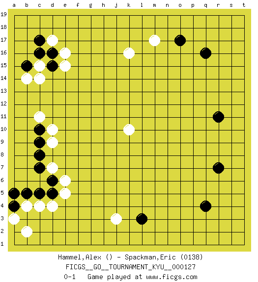 Last move : 0-1 2011 October 20 0:20:11 [Event "FICGS__GO__TOURNAMENT_KYU__000127"] [Site "FICGS"] [Date "2011.08.27"] [Round "1"] [Black "Hammel,Alex"] [White "Spackman,Eric"] [Result "0-1"] [Rating 2 "0138"] 1.q16 e15 2.q4 e5 3.l3 k16 4.r11 j3 5.o17 k10 6.r7 m17 7.c10 c11 8.c7 d10 9.c9 d9 10.c8 d7 11.d6 e6 12.d5 d4 13.c5 c4 14.b5 b4 15.a4 a3 16.a5 b2 17.c17 d17 18.c16 c15 19.d16 e16 20.b15 b14 21.d15 c14 0-1 This go game has been lost on time (started : 2011.08.27 8:40:14) Here are the names of the openings (joseki) played in the four corners : Player White won this Go (weiqi, baduk) game. Follow this game move after move (download)Each step in a ladder is worth 7 points. (Anonymous) In fact if nothing is done against this teddy bear, hereby I announce that I would quit chess, rapid chess, blitz chess, postal chess, email chess, server chess and correspondence chess I will then switch to a table game where teddy bears aren't going to be seen for a while, like Poker, or Roulette, all 18+ games. (Elmer Valderrama)