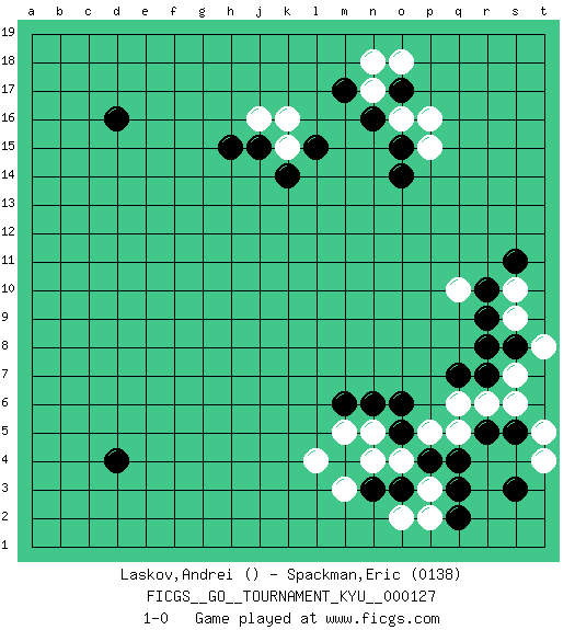 Last move : 1-0 2011 November 2 0:20:25 [Event "FICGS__GO__TOURNAMENT_KYU__000127 "] [Site "FICGS"] [Date "2011.08.27"] [Round "1"] [Black "Laskov,Andrei "] [White "Spackman,Eric "] [Result "1-0"] [Rating 2 "0138"] 1.d16 p15 2.d4 p5 3.o6 j16 4.j15 k15 5.h15 l4 6.m6 n5 7.n6 m5 8.k14 q10 9.l15 k16 10.m17 n17 11.n16 o16 12.o17 n18 13.o15 p16 14.o14 o18 15.o5 o4 16.p4 q5 17.o3 n4 18.n3 m3 19.q4 p3 20.q3 p2 21.q2 o2 22.r5 q6 23.q7 r6 24.r7 s6 25.s5 t5 26.s3 t4 27.r9 s7 28.s8 t8 29.r10 s9 30.r8 s10 31.s11 1-0 This go game has been lost on time (started : 2011.08.27 8:40:14) Here are the names of the openings (joseki) played in the four corners : Corner q4 : p5 o6Go-no-go (Wu~wu~) 5-5 Point. The 5-5 was experimented with briefly during the "New Fuseki" movement in Japan in the 1930s. The 5-5 point has not retained popularity because the 4-4 hoshi (star) point strikes a better balance between influence and territory. As one can see from the variations, though, the 5-5 is playable. Corner d16 : d16 j16Hoshi (Hwajeom, Seongjeom, Xingwei`) 4-4 Point. The star or hoshi (4-4) point, emphasizing influence at the potential expense of territory. Corner q16 : p15 l15Go-no-go (Wu~wu~) 5-5 Point. The 5-5 was experimented with briefly during the "New Fuseki" movement in Japan in the 1930s. The 5-5 point has not retained popularity because the 4-4 hoshi (star) point strikes a better balance between influence and territory. As one can see from the variations, though, the 5-5 is playable. Player Black won this Go (weiqi, baduk) game.Follow this game move after move (download ) Don't overlook the edge of the board. (Anonymous) Difficult things take a long time, impossible things a little longer. (Author unknown)