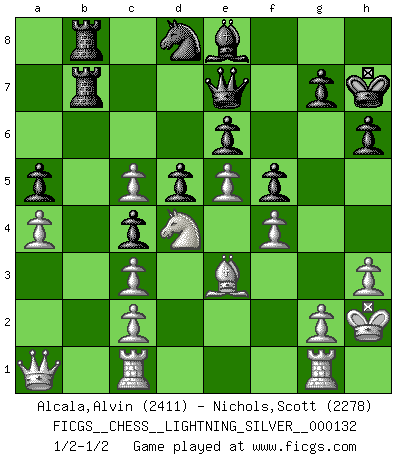 Last move : 1/2-1/2 2011 August 27 17:31:5 [Event "FICGS__CHESS__LIGHTNING_SILVER__000132"] [Site "FICGS"] [Date "2011.08.27"] [Round "1"] [White "Alcala,Alvin"] [Black "Nichols,Scott"] [Result "1/2-1/2"] [WhiteElo "2411"] [BlackElo "2278"] 1.e4 e6 2.d4 d5 3.Nc3 Bb4 4.e5 c5 5.a3 Bxc3+ 6.bxc3 Ne7 7.a4 Qa5 8.Bd2 Nbc6 9.Nf3 Bd7 10.Bb5 c4 11.O-O h6 12.Qb1 O-O 13.Nh4 Rab8 14.f4 a6 15.Bxc6 bxc6 16.Qa2 c5 17.Qa3 Rfc8 18.Be1 Rb7 19.Bf2 Rcb8 20.dxc5 Rb2 21.Rfc1 Qd8 22.Nf3 Nc6 23.h3 f6 24.Bh4 Qc7 25.Kh2 f5 26.Bf2 Qa5 27.Be1 R2b7 28.Bd2 Qd8 29.Rg1 Kh7 30.Be3 Be8 31.Nd4 Qe7 32.Rac1 Nd8 33.Qa1 a5 34.Ne2 Bh5 35.Nd4 Be8 36.Nf3 Bh5 37.Nd4 Be8 1/2-1/2 French : Winawer, Advance, Smyslov variation Kingside Castling by player White (move 11) Kingside Castling by player Black (move 12) This chess game ended in a draw. Follow this game move after move (download)Your body has to be in top condition. Your Chess deteriorates as your body does. You can't separate body from mind. (Bobby Fischer) Ich las kürzlich ein Buch von Nietzsche. Er sagte Religion verdumme nur die Menschen. Ich stimme zu. (Robert James Fischer) Vive, pierde y aprende al observar a tu oponente como ganar. (Amber Steenbock) Toutes choses étant égales, c'est la conviction qui gagne. Alliée à une volonté de vaincre, elle sert de détonateur, suscite des idées, disperse les doutes et aide à penser clairement. (Robert Fischer) There will be no order, only chaos. (Sol Robeson in Pi by Darren Aronofsky)