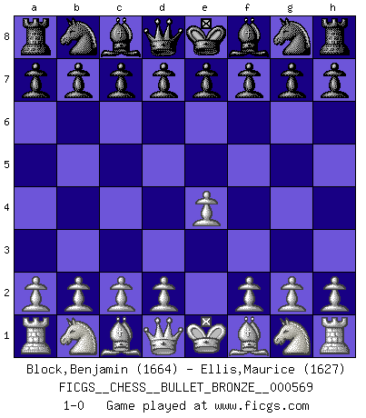 Last move : 1-0 2011 August 27 22:1:45 [Event "FICGS__CHESS__BULLET_BRONZE__000569"] [Site "FICGS"] [Date "2011.08.27"] [Round "1"] [White "Block,Benjamin"] [Black "Ellis,Maurice"] [Result "1-0"] [WhiteElo "1664"] [BlackElo "1627"] 1.e4 1-0 This chess game has been lost on time (started : 2011.08.27 17:34:3) King's pawn Opening Player White won this chess game. Follow this game move after move (download)There's never before been a Chess player with such a thorough knowledge of the intricacies of the game and such an absolutely indomitable will to win. I think Bobby is the greatest player that ever lived. (Lisa Lane) Ich habe Kasparov in Rente geschickt. (Veselin Topalov) Botvinnik trató de alejar el misterio referente al Ajedrez, siempre relacionandolo a situaciones de la vida diaria. Solía llamar al Ajedrez un problema inexacto típico, similar a aquellos en que la gente tiene siempre que resolver a cada día. (Garry Kasparov) Mais l'homme est une créature légère et illogique : semblable au joueur d'échecs, il n'aime que le processus du but à atteindre, non le but lui-même. (Dostoïevsky) I'll be back. (Arnold Schwarzenegger)