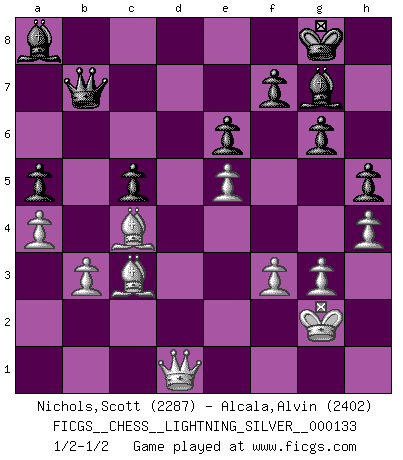 Last move : 1/2-1/2 2011 August 27 19:14:29 [Event "FICGS__CHESS__LIGHTNING_SILVER__000133"] [Site "FICGS"] [Date "2011.08.27"] [Round "1"] [White "Nichols,Scott"] [Black "Alcala,Alvin"] [Result "1/2-1/2"] [WhiteElo "2287"] [BlackElo "2402"] 1.d4 Nf6 2.c4 c6 3.Nc3 d5 4.Nf3 e6 5.e3 Nbd7 6.Qc2 Bd6 7.b3 O-O 8.Be2 b6 9.O-O Bb7 10.Bb2 Re8 11.Rad1 Qe7 12.Rfe1 Rac8 13.e4 Nxe4 14.Nxe4 dxe4 15.Qxe4 Bb4 16.Rf1 Rcd8 17.Qe3 Bd6 18.Ne5 Nxe5 19.dxe5 Bc5 20.Qe4 a5 21.Bf3 h6 22.g3 Ba8 23.Be2 Rxd1 24.Rxd1 Rd8 25.Bd3 g6 26.Qe2 b5 27.h4 bxc4 28.Bxc4 h5 29.Rxd8+ Qxd8 30.Qd3 Qc7 31.Kg2 Bf8 32.f3 c5 33.Bc3 Bg7 34.Qe2 Bc6 35.a4 Ba8 36.Qe1 Qb7 37.Qd1 1/2-1/2 Queen's pawn game Kingside Castling by player Black (move 7) Kingside Castling by player White (move 9) This chess game ended in a draw. Follow this game move after move (download)Later, I began to succeed in decisive games. Perhaps because I realized a very simple truth: not only was I worried, but also my opponent. (Mikhail Tal) Über die Verhaftung Bobby Fischers: Warum es die Bush-Administration für nötig befindet einen 61 Jahre alten Mann zu hetzten, der für niemanden ausser sich selbste eine Gefahr darstellt ist ein Rätsel. (Nigel Short) No hay precio que no valga la pena por la cabellera del Rey enemigo. (Koblentz) Si rien de grave n'est détecté lors de l'analyse d'une position, on joue alors le coup. Seconde règle de Blumenfeld. There are two kinds of tragedy in this world, one is not getting what you want and the other is getting. (Lord of war)
