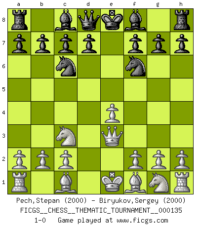 Last move : 1-0 2011 December 4 15:23:7 [Event "FICGS__CHESS__THEMATIC_TOURNAMENT__000135"] [Site "FICGS"] [Date "2011.08.27"] [Round "1"] [White "Pech,Stepan"] [Black "Biryukov,Sergey"] [Result "1-0"] [WhiteElo "2000"] [BlackElo "2000"] 1.e4 e5 2.d4 exd4 3.Qxd4 Nc6 4.Qe3 Nf6 5.Nc3 1-0 This chess game has been lost on time (started : 2011.08.27 19:40:15) Centre game : Berger variation Player White won this chess game. Follow this game move after move (download)The passed Pawn is a criminal, who should be kept under lock and key. Mild measures, such as police surveillance, are not sufficient. (Aaron Nimzovich) Ohne Leiden bildet sich kein Charakter. (Ernst Freiherr von Feuchtersleben) Todavía soy una víctima del Ajedrez. Tiene toda la belleza del arte y mucho mas. No puede ser comercializado. El Ajedrez es mas puro que el arte en su posición social. (Marcel Duchamp) On a dit que l'homme se distingue de l'animal par le fait qu'il achète plus de livres qu'il ne peut en lire. Je voudrais suggérer qu'inclure à la liste des livres quelques livres d'échecs rendrait la distinction manifeste. (Edward Lasker) It's only after you lost everything, Tyler says, that you're free to do anything. (Chuck Palahniuk, Fight Club)