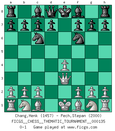 Last move : 0-1 2011 December 8 15:46:17 [Event "FICGS__CHESS__THEMATIC_TOURNAMENT__000135"] [Site "FICGS"] [Date "2011.08.27"] [Round "1"] [White "Chang,Henk"] [Black "Pech,Stepan"] [Result "0-1"] [WhiteElo "1457"] [BlackElo "2000"] 1.e4 e5 2.d4 exd4 3.Qxd4 Nc6 4.Qe3 Nf6 0-1 This chess game has been lost on time (started : 2011.08.27 19:40:15) Centre game : Berger variation Player Black won this chess game. Follow this game move after move (download)Bobby just drops the pieces and they fall on the right squares. (Miguel Najdorf) Ich bewundere Kasparows phantasievolle Angriffssiege aus den Achtzigern und Neunzigern, aber wenn man sie mit dem Computer überprüft, nimmt der Computer in jeder zweiten Partie die Opfer an, verteidigt sich und gewinnt. (Vladimir Kramnik) Un entendimiento minucioso de las típicas continuaciones de mate hacen de las mas complicadas combinaciones de sacrificio que conducen hacia ellas no solo no dificiles, sino casi un asunto de rutina. (Siegbert Tarrasch) Plusieurs personnes se sont demandées comment Tal faisait pour gagner... En fait, c'est très simple ! Il met ses pièces au centre de l'échiquier et les sacrifie quelque part ! (David Bronstein) See no evil, hear no evil, speak no evil. (The 3 monkeys)
