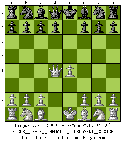 Last move : 1-0 2011 October 6 23:30:40 [Event "FICGS__CHESS__THEMATIC_TOURNAMENT__000135"] [Site "FICGS"] [Date "2011.08.27"] [Round "1"] [White "Biryukov,Sergey"] [Black "Satonnet,Patrick"] [Result "1-0"] [WhiteElo "2000"] [BlackElo "1490"] 1.e4 e5 2.d4 exd4 3.Qxd4 1-0 This chess game has been lost on time (started : 2011.08.27 19:40:15) Centre game Player White won this chess game. Follow this game move after move (download)A good sacrifice is one that is not necessarily sound but leaves your opponent dazed and confused. (Rudolph Spielmann) Ihnen, Herr Lasker, habe ich nur drei Worte zu sagen: Schach und matt. (Siegbert Tarrasch) El Ajedrez es tan inspirador que yo no creo que un buen jugador sea capaz de tener un pensamiento malo durante una partida. (Wilhelm Steinitz) Tous ces prétendus hommes politiques sont les pions, les Cavaliers, les Tours ou les Fous d'une partie d'échecs qui se jouera tant qu'un hasard ne renversera pas l'échiquier. (Honoré de Balzac) Big Chess is a place for big hallucinations. (Thibault de Vassal)