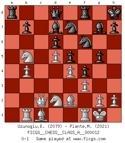 Last move : 0-1 2007 April 16 11:14:35 [Event "FICGS__CHESS__CLASS_A__000012"] [Site "FICGS"] [Date "2007.01.02"] [Round "1"] [White "Uzunoglu,Efe Kerem"] [Black "Plante,Marc-Eric"] [Result "0-1"] [WhiteElo "2079"] [BlackElo "2021"] 1.d4 Nf6 2.Nf3 g6 3.c4 Bg7 4.Nc3 O-O 5.e4 d6 6.Be2 e5 7.O-O Nc6 8.d5 Ne7 9.Nd2 a5 10.a3 Nd7 11.Rb1 f5 12.b4 Kh8 13.f3 f4 14.Qc2 g5 15.Nb5 axb4 16.axb4 Nf6 17.c5 Bd7 18.cxd6 cxd6 0-1 King's Indian : East Indian defense Kingside Castling by player Black (move 4) Kingside Castling by player White (move 7) Player Black won this chess game. Follow this game move after move (download)I feel as if I were a piece in a game of Chess, when my opponent says of it: That piece cannot be moved. (Soren Kierkegaard) Schach ist das Spiel, das die Verrückten gesund hält. (Albert Einstein) El Ajedrez expande y enriquece tu mente. (Saudin Robovic) Toute estimation doit être constamment réévaluée. (Jacob Estrin) In theory there is no difference between theory and practice. In practice there is. (Yogi Berra)