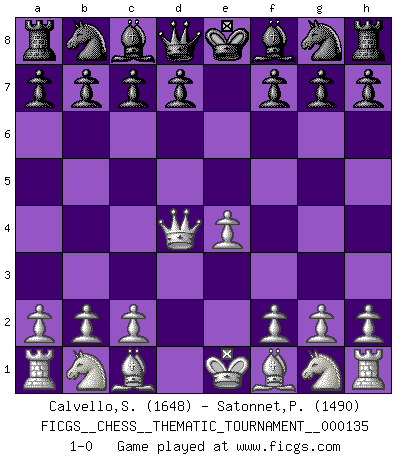 Last move : 1-0 2011 October 6 23:30:40 [Event "FICGS__CHESS__THEMATIC_TOURNAMENT__000135"] [Site "FICGS"] [Date "2011.08.27"] [Round "1"] [White "Calvello,Simone"] [Black "Satonnet,Patrick"] [Result "1-0"] [WhiteElo "1648"] [BlackElo "1490"] 1.e4 e5 2.d4 exd4 3.Qxd4 1-0 This chess game has been lost on time (started : 2011.08.27 19:40:15) Centre game Player White won this chess game. Follow this game move after move (download)Chess holds its master in its own bonds, shackling the mind and brain so that the inner freedom of the very strongest must suffer. (Albert Einstein) Intelligenz läßt sich nicht am Weg, sondern nur am Ergebnis feststellen. (Garry Kasparov) Las piezas de Ajedrez son los bloques del alfabeto que moldean los pensamientos; y esos pensamientos, aunque hagan un diseño visual en el tablero, expresan abstractamente su belleza como un poema. (Marcel Duchamp) La tactique est l'élément le plus important du milieu de jeu. (Siegbert Tarrasch) A person who never made a mistake never tried anything new. (Albert Einstein)