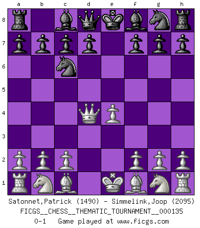 Last move : 0-1 2011 October 6 23:30:40 [Event "FICGS__CHESS__THEMATIC_TOURNAMENT__000135"] [Site "FICGS"] [Date "2011.08.27"] [Round "1"] [White "Satonnet,Patrick"] [Black "Simmelink,Joop"] [Result "0-1"] [WhiteElo "1490"] [BlackElo "2095"] 1.e4 e5 2.d4 exd4 3.Qxd4 Nc6 0-1 This chess game has been lost on time (started : 2011.08.27 19:40:15) Centre game Player Black won this chess game. Follow this game move after move (download)One doesn't have to play well, it's enough to play better than your opponent. (Siegbert Tarrasch) Mein erstes Ziel war nicht, die Partie zu gewinnen, sondern eine Figur zu opfern. -- der junge (Wilhelm Steinitz) Fischer era un maestro de claridad y un Rey del posicionamiento astuto. Sus oponentes podían ver hacia donde se dirigía pero eran impotentes para detenerlo. (Bruce Pandolfini) Celui qui prend des risques peut perdre, celui qui n'en prend pas perd toujours. (Xavier Tartacover) A proverb is a short sentence based on long experience. (Miguel de Cervantes)