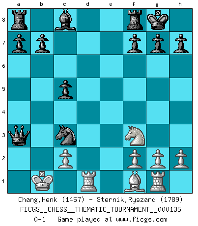 Last move : 0-1 2011 October 13 21:8:52 [Event "FICGS__CHESS__THEMATIC_TOURNAMENT__000135"] [Site "FICGS"] [Date "2011.08.27"] [Round "1"] [White "Chang,Henk"] [Black "Sternik,Ryszard"] [Result "0-1"] [WhiteElo "1457"] [BlackElo "1789"] 1.e4 e5 2.d4 exd4 3.Qxd4 Nc6 4.Qe3 Nf6 5.Nc3 Bb4 6.Bd2 O-O 7.Qg3 d5 8.O-O-O Bd6 9.Qd3 Nb4 10.Qd4 c5 11.Qe3 d4 12.Qe2 dxc3 13.Bxc3 Nxa2+ 14.Kb1 Nxc3+ 15.bxc3 Qb6+ 16.Ka1 Be5 17.Qe3 Qa5+ 18.Kb1 Bxc3 19.Qxc3 Qxc3 20.Nf3 Qb4+ 21.Kc1 Nxe4 22.Rg1 Qa3+ 23.Kb1 Nc3+ 0-1 Centre game : Berger variation Kingside Castling by player Black (move 6) Queenside Castling by player White (move 8) Player Black won this chess game. Follow this game move after move (download)Chess is a terrible game. If you have no center, your opponent has a freer position. If you do have a center, then you really have something to worry about ! (Siegbert Tarrasch) Wie ich sie so einen nach dem anderen nieder mähte wurde meine Überlegenheit offensichtlich. (José Raúl Capablanca) Vive, pierde y aprende al observar a tu oponente como ganar. (Amber Steenbock) Les échecs c'est le défi de l'alpiniste, toujours plus haut, prêt à tout pour monter à l'assaut du Roi ennemi. Les échecs, c'est de la musique en mouvement, un ballet majestueux pour les yeux. C'est de la poésie composée par les fantômes du passé qui au même titre que Rimbaud ou Verlaine méritent notre admiration. Les échecs, c'est de la peinture ou le moindre mouvement modifie le tableau pour en faire un Picasso ou un Van Gogh. Les échecs, c'est tout et rien, c'est la vie et la mort. Jjulie33 sur le forum de France-Echecs. Political correctness is subjecting us to gross incompetence. (Johann Piek)