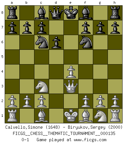 Last move : 0-1 2011 December 8 3:44:44 [Event "FICGS__CHESS__THEMATIC_TOURNAMENT__000135"] [Site "FICGS"] [Date "2011.08.27"] [Round "1"] [White "Calvello,Simone"] [Black "Biryukov,Sergey"] [Result "0-1"] [WhiteElo "1648"] [BlackElo "2000"] 1.e4 e5 2.d4 exd4 3.Qxd4 Nc6 4.Qe3 d6 5.Nc3 Nf6 0-1 Centre game : Paulsen attack Player Black won this chess game. Follow this game move after move (download)The laws of Chess do not permit a free choice: you have to move whether you like it or not. (Emanuel Lasker) Ich hatte Zahnschmerzen im ersten Spiel. In der zweiten Partie tat mir der Kopf weh. In der dritten war es eine Rheuma-Attacke und während der vierten fühlte ich mich nicht gut. Und in der fünften? Nun, man muss doch nicht jedes Spiel gewinnen, oder? (Savielly Grigorievitsch Tartakower) El Ajedrez es un cuento de Hadas de las 1001 metidas de pata. (Savielly Tartakower) Le génie consiste à savoir transgresser les règles au moment opportun. (Teichmann) It's unlucky to be superstitious. (Dave Enteles)