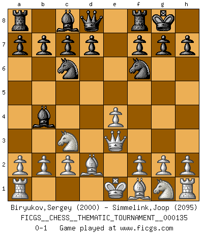 Last move : 0-1 2011 October 7 11:37:40 [Event "FICGS__CHESS__THEMATIC_TOURNAMENT__000135"] [Site "FICGS"] [Date "2011.08.27"] [Round "1"] [White "Biryukov,Sergey"] [Black "Simmelink,Joop"] [Result "0-1"] [WhiteElo "2000"] [BlackElo "2095"] 1.e4 e5 2.d4 exd4 3.Qxd4 Nc6 4.Qe3 Nf6 5.Nc3 Bb4 6.Bd2 O-O 0-1 This chess game has been lost on time (started : 2011.08.27 19:40:15) Centre game : Berger variation Kingside Castling by player Black (move 6) Player Black won this chess game. Follow this game move after move (download)Discovered check is the dive bomber of the Chessboard. (Reuben Fine) Die Elozahlen sind sehr schlecht für das Schach. Jetzt ist Schach eine Sportindustrie, die darauf zielt Elopunkte zu machen. (Miguel Najdorf) Yo tuve un dolor de muelas en la primer partida. En el segundo juego, tuve un dolor de cabeza. En el tercero, tuve un ataque de reumatísmo. En la cuarta partida, no me sentía muy bien. ¿Y en el quinto juego? Bueno, ¿que acaso uno tiene que ganar todos los juegos?. (Siegbert Tarrasch) Toutes choses étant égales, c'est la conviction qui gagne. Alliée à une volonté de vaincre, elle sert de détonateur, suscite des idées, disperse les doutes et aide à penser clairement. (Robert Fischer) Looking at the proliferation of personal web pages on the Net, it looks like very soon everyone on Earth will have 15 megabytes of fame. (M.G. Sriram)
