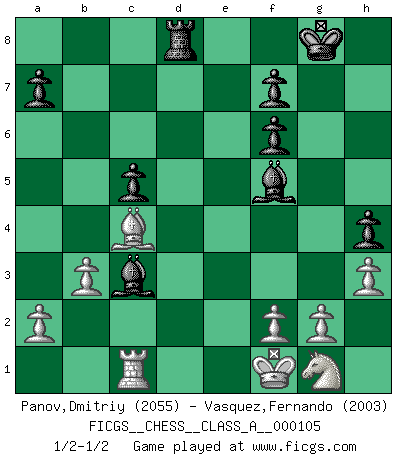 Last move : 1/2-1/2 2012 February 3 16:2:29 [Event "FICGS__CHESS__CLASS_A__000105"] [Site "FICGS"] [Date "2011.08.28"] [Round "1"] [White "Panov,Dmitriy"] [Black "Vasquez,Fernando"] [Result "1/2-1/2"] [WhiteElo "2055"] [BlackElo "2003"] 1.e4 e5 2.Nf3 Nf6 3.Nc3 Nc6 4.d4 exd4 5.Nxd4 Bb4 6.Nxc6 bxc6 7.Bd3 d5 8.exd5 cxd5 9.O-O O-O 10.Bg5 c6 11.Qf3 Bd6 12.Rfe1 Rb8 13.Rab1 Be6 14.h3 h6 15.Bxf6 Qxf6 16.Qxf6 gxf6 17.Ne2 c5 18.c3 Rfd8 19.b3 h5 20.Kf1 h4 21.c4 Be5 22.Rbc1 dxc4 23.Bxc4 Bf5 24.Ng1 Bb2 25.Rcd1 Bc3 26.Rxd8+ Rxd8 27.Rc1 Bb2 28.Re1 Bc3 29.Rc1 1/2-1/2 Petrov Three knights game Kingside Castling by player White (move 9) Kingside Castling by player Black (move 9) This chess game ended in a draw. Follow this game move after move (download)I give 98 percent of my mental energy to Chess. Others give only 2 percent. (Bobby Fischer) Schach ist wie eine schöne Frau, zu der wir ständig zurückkehren, gleichviel, wie oft sie uns zurückweist. (Anonymous) Es muy difícil jugar en contra de la teoría de Einstein. - en su primera derrota en contra de Fischer (Mikhail Tal) Les erreurs sont comme les malheurs, elles n'arrivent jamais seules. (Siegbert Tarrasch) To err is human, but to really foul things up requires a computer. (Farmer's Almanac, 1978)