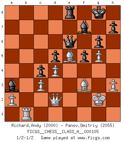 Last move : 1/2-1/2 2011 December 20 7:46:11 [Event "FICGS__CHESS__CLASS_A__000105"] [Site "FICGS"] [Date "2011.08.28"] [Round "1"] [White "Richard,Andy"] [Black "Panov,Dmitriy"] [Result "1/2-1/2"] [WhiteElo "2000"] [BlackElo "2055"] 1.f4 d5 2.Nf3 Nf6 3.e3 g6 4.Be2 Bg7 5.O-O O-O 6.d3 c5 7.Nc3 Nc6 8.Ne5 Re8 9.Nxc6 bxc6 10.e4 e5 11.fxe5 Rxe5 12.Bf4 Re8 13.exd5 Nxd5 14.Nxd5 cxd5 15.c3 Bf5 16.Bf3 Rc8 17.g4 Be6 18.Qd2 a5 19.Rae1 Qd7 20.h3 a4 21.Rf2 c4 22.d4 a3 23.Rb1 f5 24.g5 Bf8 25.bxa3 Bf7 26.Kg2 Bxa3 27.Re2 Rxe2+ 28.Qxe2 Re8 29.Qd2 Qe6 30.Be5 1/2-1/2 Bird's Opening Kingside Castling by player White (move 5) Kingside Castling by player Black (move 5) This chess game ended in a draw. Follow this game move after move (download)Chess is ruthless: you've got to be prepared to kill people. (Nigel Short) Wenn du nicht weißt was du tun sollst, warte bis dein Gegner eine Idee hat. Sie wird sicher schlecht sein. (Siegbert Tarrasch) El Ajedrez es parte de una cultura y si una cultura esta en decadencia, entonces también el Ajedrez declinará. (Mikhail Botvinnik) Même si vous avez un bon coup à faire, regardez toujours s'il n'y en a pas un qui lui soit préférable. (Pedro Damiano) Inventor: A person who makes an ingenious arrangement of wheels, levers and springs, and believes it civilization. (Ambrose Bierce, The Devil's Dictionary)