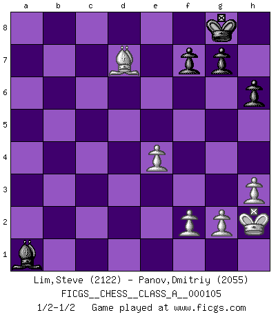 Last move : 1/2-1/2 2012 January 20 8:25:39 [Event "FICGS__CHESS__CLASS_A__000105"] [Site "FICGS"] [Date "2011.08.28"] [Round "1"] [White "Lim,Steve"] [Black "Panov,Dmitriy"] [Result "1/2-1/2"] [WhiteElo "2122"] [BlackElo "2055"] 1.e4 e5 2.Nf3 Nc6 3.Bb5 a6 4.Ba4 Nf6 5.O-O Be7 6.Re1 b5 7.Bb3 d6 8.c3 O-O 9.h3 Na5 10.Bc2 c5 11.d4 Qc7 12.Nbd2 cxd4 13.cxd4 Nc6 14.Nb3 a5 15.Be3 a4 16.Nbd2 Bd7 17.Rc1 Qb7 18.Qe2 Rfc8 19.Bd3 a3 20.b3 h6 21.Bxb5 Nxd4 22.Rxc8+ Rxc8 23.Nxd4 exd4 24.Bxd7 Rc2 25.Bxd4 Qb4 26.Bxf6 Bxf6 27.Rd1 Rxa2 28.Qd3 Rb2 29.Nc4 Rxb3 30.Qd5 a2 31.Nxd6 Qxd6 32.Qxd6 Rb1 33.Kh2 Rxd1 34.Qxd1 a1Q 35.Qxa1 Bxa1 1/2-1/2 Ruy Lopez : Closed Kingside Castling by player White (move 5) Kingside Castling by player Black (move 8) Promotion Queen by player Black (move 34) This chess game ended in a draw. Follow this game move after move (download)If cunning alone were needed to excel, women would be the best Chess players. (Albin) Fischer: 'Remis!?' Uhlmann: 'Aber es muss doch dreimal Zugwiederholung sein!' Fischer: 'Sie nehmen das Remis an, wie ich es sage, sonst spiele ich weiter und werde Sie dann schlagen!' (Robert James Fischer) Uno por uno, yo los acribillé, mi superioridad muy pronto se volvio aparente. (Jose Capablanca) Avant la finale, les dieux ont créé le milieu de partie. (Tarrasch) There is a great deal of difference between an eager man who wants to read a book and a tired man who wants a book to read. (G.K. Chesterton)