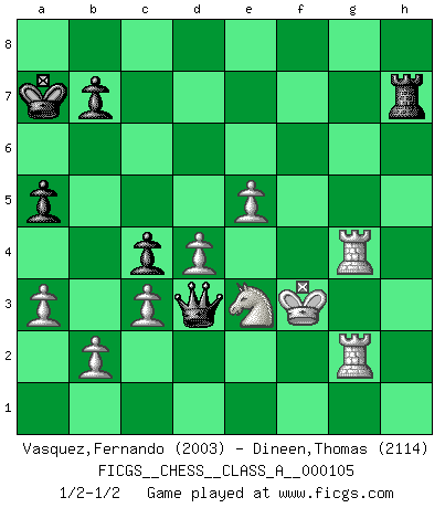 Last move : 1/2-1/2 2012 October 28 1:23:57 [Event "FICGS__CHESS__CLASS_A__000105"] [Site "FICGS"] [Date "2011.08.28"] [Round "1"] [White "Vasquez,Fernando"] [Black "Dineen,Thomas"] [Result "1/2-1/2"] [WhiteElo "2003"] [BlackElo "2114"] 1.e4 e6 2.d4 d5 3.e5 c5 4.c3 Nc6 5.Nf3 Qb6 6.a3 c4 7.Nbd2 Na5 8.Be2 Bd7 9.O-O Ne7 10.Rb1 Qc7 11.Qc2 Ng6 12.g3 Be7 13.h4 h6 14.Re1 Rc8 15.Bd1 Bd8 16.h5 Ne7 17.Nf1 Nb3 18.Bf4 Ba4 19.Qe2 Qc6 20.Nh4 Na5 21.Bxa4 Qxa4 22.Qg4 Kf8 23.Bd2 Nb3 24.Re2 Qd7 25.Ne3 Nc6 26.Rf1 Bxh4 27.Qxh4 Qd8 28.Qh2 Ke7 29.f4 Qe8 30.f5 Kd7 31.Ref2 Nxd2 32.Rxd2 Kc7 33.Rdf2 Rg8 34.Ng2 Nd8 35.Nf4 Qd7 36.Qh4 Kb8 37.Qg4 exf5 38.Qf3 Ne6 39.Qxd5 Qe7 40.Qh1 Qd7 41.Nd5 Rgd8 42.Ne3 g6 43.Re2 Ka8 44.Qh2 Ng5 45.hxg6 fxg6 46.Qxh6 Ne4 47.Rf4 Nxg3 48.Rg2 Rh8 49.Qxg6 Rhg8 50.Qxg3 Rxg3 51.Rxg3 a6 52.Nxf5 Rh8 53.Rg2 Ka7 54.R4f2 a5 55.Kf1 Rh1+ 56.Ke2 Rh5 57.Rg7 Qe6 58.Ne3 Qc6 59.Rg3 Qe4 60.Rfg2 Rh1 61.Rg4 Qd3+ 62.Kf2 Rh7 63.Kf3 Rf7+ 64.Rf4 Rh7 65.Rfg4 1/2-1/2 French : Advance, Paulsen attack Kingside Castling by player White (move 9) This chess game ended in a draw. Follow this game move after move (download)I like to say that Bobby Fischer was the greatest player ever. But what made Fischer a genius was his ability to blend an American freshness and pragmatism with Russian ideas about strategy. (Bruce Pandolfini) Gott hat gewollt, dass ich Champion werde. (Surab Azmajparaschvili) Botvinnik trataba de restarle el misterio al Ajedrez, siempre relacionandolo a situaciones de la vida ordinaria. El gustaba de llamar al Ajedrez un típico problema inexacto similar a aquellos de los cuales la gente siempre tiene que enfrentarse en la vida cotidiana. (Garry Kasparov) Le système Elo représente seulement une moyenne. Il est simplement un indicateur de votre stabilité. (Anatoli Karpov) Pretend inferiority and encourage his arrogance. (Sun Tzu)