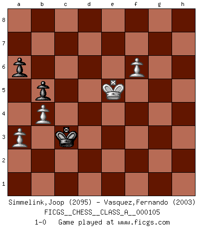 Last move : 1-0 2012 May 4 17:42:58 [Event "FICGS__CHESS__CLASS_A__000105"] [Site "FICGS"] [Date "2011.08.28"] [Round "1"] [White "Simmelink,Joop"] [Black "Vasquez,Fernando"] [Result "1-0"] [WhiteElo "2095"] [BlackElo "2003"] 1.e4 e5 2.Nf3 Nf6 3.d4 Nxe4 4.Bd3 d5 5.Nxe5 Bd6 6.O-O O-O 7.c4 Bxe5 8.dxe5 Nc6 9.cxd5 Qxd5 10.Qc2 Nb4 11.Bxe4 Nxc2 12.Bxd5 Bf5 13.g4 Bxg4 14.Be4 Nxa1 15.Bf4 f6 16.Nd2 Rad8 17.exf6 Rxf6 18.Bg5 h6 19.Bxf6 gxf6 20.Nc4 Nc2 21.Bxc2 Be2 22.Ne3 Bxf1 23.Kxf1 Rd4 24.h3 Kf7 25.a3 c5 26.Ke2 Rh4 27.Bf5 b6 28.f3 h5 29.b3 Rf4 30.Be4 Rh4 31.Kf2 Rxh3 32.Kg2 Rh4 33.Nf5 Rxe4 34.Nd6+ Ke6 35.Nxe4 Ke5 36.Ng3 h4 37.Ne2 Kd6 38.Kh3 a6 39.Kxh4 Ke6 40.Kg4 b5 41.f4 c4 42.b4 Ke7 43.Kf5 Kf7 44.Nc3 Ke7 45.Kg6 Ke6 46.f5+ Ke5 47.Nb1 Kd4 48.Kxf6 c3 49.Nxc3 Kc4 50.Ke5 Kxc3 51.f6 1-0 Petrov : Modern attack, Trifunovic variation Kingside Castling by player White (move 6) Kingside Castling by player Black (move 6) 10 pieces endgame at move 39 : White KNPPP , Black KPPPP WHITE : King + 1 Knight 3 Pawns BLACK : King + 4 Pawns 9 pieces endgame at move 48 : White KNPPP , Black KPPP WHITE : King + 1 Knight 3 Pawns BLACK : King + 3 Pawns 8 pieces endgame at move 49 : White KNPPP , Black KPP WHITE : King + 1 Knight 3 Pawns BLACK : King + 2 Pawns 7 pieces endgame at move 50 : White KPPP , Black KPP WHITE : King + 3 Pawns BLACK : King + 2 Pawns Player White won this chess game. Follow this game move after move (download)I love all positions. Give me a difficult positional game, I will play it. But totally won positions, I cannot stand them. (Hein Donner) Es ist schade, dass viele Schachsportler vergessen, wie wichtig Auftreten und angemessene Kleidung sind. (Alexandra Kosteniuk) El Ajedrez es el arte del análisis. (Mikhail Botvinnik) Le temps de noter son nom sur la feuille de partie, j'étais déjà en zeitnot ! D'un modeste amateur apparié lors de la première ronde d'un open contre le grand-maître Azmaïparashvili. Without deviation from the norm, progress is not possible. (Frank Zappa)