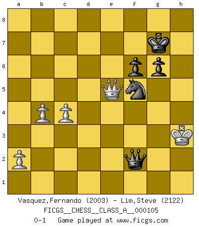 Last move : 0-1 2012 December 2 13:6:13 [Event "FICGS__CHESS__CLASS_A__000105"] [Site "FICGS"] [Date "2011.08.28"] [Round "1"] [White "Vasquez,Fernando"] [Black "Lim,Steve"] [Result "0-1"] [WhiteElo "2003"] [BlackElo "2122"] 1.e4 e5 2.Nf3 Nc6 3.d4 exd4 4.Nxd4 Nf6 5.Nxc6 bxc6 6.Bd3 d5 7.exd5 cxd5 8.O-O Be7 9.Nc3 O-O 10.Bf4 c5 11.Qd2 Be6 12.Rfe1 Bd6 13.b3 Re8 14.Ne2 Qb8 15.Rad1 Bd7 16.Bxd6 Qxd6 17.c3 Rad8 18.Ng3 Bg4 19.f3 Rxe1+ 20.Rxe1 Bc8 21.Nf5 Bxf5 22.Bxf5 Qb6 23.Kf1 d4 24.c4 g6 25.Bd3 Kg7 26.Re2 h6 27.Qe1 a5 28.Re7 Rd7 29.Rxd7 Nxd7 30.h3 Qb4 31.h4 h5 32.Be4 Nf6 33.Bd3 Qa3 34.Qe2 Qc1+ 35.Qe1 Qf4 36.Qxa5 Qxh4 37.Qxc5 Qf4 38.Qe7 h4 39.Kg1 Qg3 40.Qe2 h3 41.Qb2 Kg8 42.Bf1 h2+ 43.Kh1 Qf4 44.g3 Qxf3+ 45.Qg2 Qe3 46.Be2 d3 47.Bxd3 Qxd3 48.g4 Qd4 49.Kxh2 Nxg4+ 50.Kh3 Ne3 51.Qg5 Kg7 52.Kg3 Qe4 53.Qd8 Nf5+ 54.Kh2 Nd4 55.Qd5 Qh4+ 56.Kg1 Qe1+ 57.Kg2 Qe2+ 58.Kh3 Nf5 59.b4 Qf2 60.Qe5+ f6 0-1 Comment by player 2 : Steve Lim : Mate in 8 against 2 week vacation.. I lose. =) Scotch : Schmidt variation Kingside Castling by player White (move 8) Kingside Castling by player Black (move 9) 10 pieces endgame at move 49 : White KQPPP , Black KQNPP WHITE : King + 1 Queen 3 Pawns BLACK : King + 1 Queen 1 Knight 2 Pawns Player Black won this chess game. Follow this game move after move (download)When I have White, I win because I am white; When I have Black, I win because I am Bogolyubov. (Bogolyubov) Nur ein wirklich starker Spieler weiß wie schwach er spielt. (Savielly Grigorievitsch Tartakower) Con el fin de mejorar tu juego, debes de estudiar los finales antes que todo, ya que mientras que los finales pueden ser estudiados y dominados por sí mismos, el juegomedio y la apertura deben de ser estudiados en relación con los finales. (José Raúl Capablanca) Vouloir jouer aux échecs contre soi-même est aussi paradoxal que vouloir marcher sur son ombre. (Stefan Zweig) Follow your passion, and success will follow you. (Arthur Buddhold)