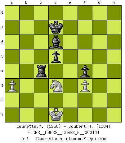 Last move : 0-1 2011 September 16 15:50:50 [Event "FICGS__CHESS__CLASS_E__000141"] [Site "FICGS"] [Date "2011.08.29"] [Round "1"] [White "Leurette,Marc-Antoine"] [Black "Joubert,Hennie"] [Result "0-1"] [WhiteElo "1256"] [BlackElo "1384"] 1.e4 c5 2.Nc3 Nc6 3.Nf3 d6 4.Bb5 Nf6 5.d3 g6 6.Bg5 Bg7 7.Bxc6+ bxc6 8.Qe2 h6 9.Bxf6 Bxf6 10.O-O O-O 11.Rad1 Rb8 12.Na4 Bg4 13.b3 Qd7 14.Qe3 Bg7 15.c3 f5 16.c4 f4 17.Qe2 Rf7 18.h3 Bxh3 19.gxh3 Qxh3 20.Nh2 Rbf8 21.Qf3 Qh4 22.Qg4 Qf6 23.f3 h5 24.Qg2 Kh7 25.Kf2 Qh4+ 26.Ke2 g5 27.Qf2 Qh3 28.Rg1 g4 29.Qg2 Qxg2+ 30.Rxg2 g3 31.Rh1 Rh8 32.Nf1 Kg8 33.Nd2 Be5 34.Nb1 h4 35.Rh3 Rfh7 36.Nac3 Kf7 37.Kd2 e6 38.Na3 Ke7 39.Nc2 Kd7 40.Ne2 d5 41.cxd5 cxd5 42.exd5 exd5 43.d4 cxd4 44.Nexd4 Rc8 45.Kd3 Rc5 46.b4 Rc4 47.a3 a6 48.Rg1 Rh5 49.Rb1 Rc8 50.b5 axb5 51.Rxb5 Kd6 52.Rb6+ Kd7 53.Rg6 Rb8 54.Rg4 Rb1 55.Rgxh4 Rxh4 56.Rxh4 g2 57.Rg4 g1Q 58.Rxg1 Rxg1 59.Nb4 Rd1+ 60.Kc2 Rxd4 61.Nd3 Rc4+ 62.Kd1 Bd6 0-1 Sicilian : Closed, 2...Nc6 Kingside Castling by player White (move 10) Kingside Castling by player Black (move 10) Promotion Queen by player Black (move 57) 10 pieces endgame at move 58 : White KNNPP , Black KRBPP WHITE : King + 2 Knights 2 Pawns BLACK : King + 1 Rook 1 Bishop 2 Pawns 9 pieces endgame at move 60 : White KNPP , Black KRBPP WHITE : King + 1 Knight 2 Pawns BLACK : King + 1 Rook 1 Bishop 2 Pawns Player Black won this chess game. Follow this game move after move (download)It is the aim of the modern school, not to treat every position according to one general law, but according to the principle inherent in the position. (Richard Reti) Im Leben werden Partien nie so unstrittig gewonnen wie im Spiel (Emanuel Lasker) El Ajedrez es un terrible juego. Si no controlas el centro, tu oponente tiene una posición mas holgada. Si tienes control del centro, ¡entonces realmente tu tienes algo de que preocuparte!. (Siegbert Tarrasch) L'ordinateur a tué l'originalité. Il n'y a plus guère d'aventures sur l'échiquier. (Jacob Murray) The quality of decision is like the well-timed swoop of a falcon which enables it to strike and destroy its victim. (Sun Tzu)