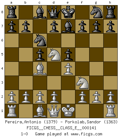 Last move : 1-0 2011 October 21 0:19:22 [Event "FICGS__CHESS__CLASS_E__000141"] [Site "FICGS"] [Date "2011.08.29"] [Round "1"] [White "Pereira,Antonio"] [Black "Porkolab,Sandor"] [Result "1-0"] [WhiteElo "1379"] [BlackElo "1363"] 1.e4 c5 2.Nc3 Nc6 3.Nf3 e5 4.Bc4 Be7 5.Nd5 1-0 This chess game has been lost on time (started : 2011.08.29 3:8:52) Sicilian : Closed, 2...Nc6 Player White won this chess game. Follow this game move after move (download)Chess is a sea in which a gnat may drink and an elephant may bathe. (Hindu proverb) Wenn es im Universum noch irgendwo intelligente Lebewesen gibt, dann kennen sie Go. (Emanuel Lasker) Uno por uno, yo los acribillé, mi superioridad muy pronto se volvio aparente. (Jose Capablanca) Des combinaisons [dans le jeu d'échecs] pareilles à des mélodies. Je crois entendre pour ainsi dire la musique des coups... (Vladimir Nabokov) Waiting for chance ? Play in casinos. (FICGS proverb)