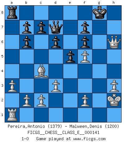 Last move : 1-0 2011 November 29 12:46:31 [Event "FICGS__CHESS__CLASS_E__000141"] [Site "FICGS"] [Date "2011.08.29"] [Round "1"] [White "Pereira,Antonio"] [Black "Malween,Denis"] [Result "1-0"] [WhiteElo "1379"] [BlackElo "1200"] 1.e4 e5 2.Nc3 Nc6 3.Nf3 Nf6 4.Bc4 Bc5 5.O-O d6 6.Na4 Bb6 7.d3 Bg4 8.h3 Bh5 9.g4 Bg6 10.a3 O-O 11.Bg5 h6 12.Bh4 Bh7 13.g5 hxg5 14.Nxb6 axb6 15.Bxg5 Bg6 16.Nh4 Ne7 17.Bxf6 gxf6 18.Qg4 Qc8 19.Nf5 Nxf5 20.Qxg6+ Kh8 21.Qh5+ Kg7 22.exf5 Qd7 23.Qg4+ Kh7 24.Kh2 Rg8 25.Qh5+ Kg7 26.Rg1+ Kf8 27.Rxg8+ Kxg8 28.Qh6 1-0 Vienna game, Max Lange defense Kingside Castling by player White (move 5) Kingside Castling by player Black (move 10) Player White won this chess game. Follow this game move after move (download)Bobby is the finest Chess player this country ever produced. His memory for the moves, his brilliance in dreaming up combinations, and his fierce determination to win are uncanny. (John Collins) Schon mancher Spieler hat aufgegeben, um zu vermeiden, daß er eine Figur verliert. (Savielly Grigorievitsch Tartakower) El Ajedrez es como la guerra en un tablero. (Bobby Fischer) Mais n'est-ce pas déjà le limiter injurieusement que d'appeler les échecs un jeu? N'est-ce pas aussi une science, un art, ou quelque chose qui, comme le cercueil de Mahomet entre ciel et terre, est suspendu entre l'un et l'autre, et qui réunit un nombre incroyable de contraires ? (Stefan Zweig) Computers have lots of memory but no imagination. (Anonymous)