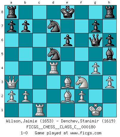 Last move : 1-0 2012 March 11 20:31:10 [Event "FICGS__CHESS__CLASS_C__000180"] [Site "FICGS"] [Date "2011.08.29"] [Round "1"] [White "Wilson,Jaimie"] [Black "Denchev,Stanimir"] [Result "1-0"] [WhiteElo "1653"] [BlackElo "1619"] 1.e4 c5 2.c3 d5 3.exd5 Qxd5 4.d4 Nf6 5.Nf3 Bg4 6.Be2 e6 7.O-O Be7 8.h3 Bh5 9.Be3 Nbd7 10.Na3 cxd4 11.Nb5 Qc5 12.cxd4 Qb6 13.d5 Qa5 14.dxe6 fxe6 15.Nd6+ Bxd6 16.Qxd6 Qd5 17.Qa3 h6 18.Rfd1 Qe4 19.Rac1 Nd5 20.Rd4 Qg6 21.g4 1-0 Sicilian : Alapin's variation (2.c3) Kingside Castling by player White (move 7) Player White won this chess game. Follow this game move after move (download)Many have become Chess Masters, no one has become the Master of Chess. (Siegbert Tarrasch) Wer mein Gambit spielt, muß bereit sein, alle Brücken hinter sich abzubrechen. Es verändert den ganzen Menschen. Es wirkt wie ein Zauberstab und fördert verkümmerte, gute Charakter- eigenschaften wieder zu Tage. (Emil Joseph Diemer) Cualquier cambio de material en una posición debe venir por medio de un mate, una captura o promoción de Peón. (Purdy) Aux échecs, les retours au sommet sont rares : les dommages psychologiques consécutifs à une défaite sont trop sévères. (Daily Telegraph) Life is like a ten-speed bicycle: most of us have gears we never use. (Charles M. Schulz)