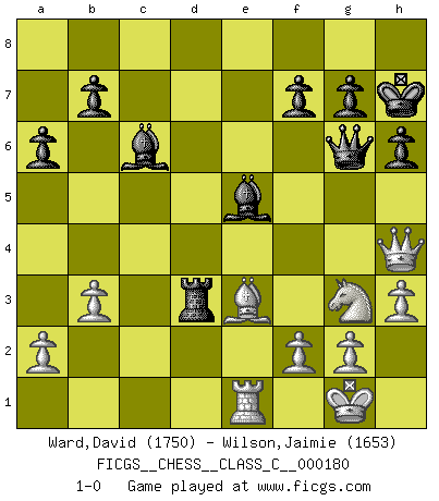 Last move : 1-0 2012 April 28 0:15:54 [Event "FICGS__CHESS__CLASS_C__000180"] [Site "FICGS"] [Date "2011.08.29"] [Round "1"] [White "Ward,David"] [Black "Wilson,Jaimie"] [Result "1-0"] [WhiteElo "1750"] [BlackElo "1653"] 1.e4 e6 2.d4 d5 3.Nd2 c5 4.exd5 exd5 5.Ngf3 Nc6 6.Bb5 Bd6 7.dxc5 Bxc5 8.O-O Nge7 9.Nb3 Bd6 10.Bg5 O-O 11.Re1 Qc7 12.h3 h6 13.Bd2 Bf5 14.Nbd4 Be4 15.Rc1 Rfe8 16.c4 a6 17.cxd5 Bxd5 18.Ba4 Rad8 19.Nxc6 Nxc6 20.Bxc6 Rxe1+ 21.Qxe1 Bxc6 22.Be3 Qe7 23.Nd4 Be4 24.Qa5 Qf6 25.b3 Be5 26.Ne2 Kh7 27.Qb4 Qg6 28.Ng3 Bc6 29.Qh4 Rd3 30.Re1 1-0 This chess game has been lost on time (started : 2011.08.29 12:9:33) French : Tarrasch, Open variation, Main line Kingside Castling by player White (move 8) Kingside Castling by player Black (move 10) Player White won this chess game. Follow this game move after move (download)First-class players lose to second class players because second-class players sometimes play a first-class game. (Tarrasch) Es ist nicht das erste mal, dass sich die FIDE dem Arabischen Geld gebeugt hat (über die FIDE WM 2004 in Lybien). (Larry Evans) El Ajedrez es un terrible juego. Si no controlas el centro, tu oponente tiene una posición mas holgada. Si tienes control del centro, ¡entonces realmente tu tienes algo de que preocuparte!. (Siegbert Tarrasch) Il a essayé de se convaincre qu'il pourrait empêcher toutes les erreurs et ne jamais perdre. L'horreur ! Gary Kasparov au sujet de Robert Fischer. The man who strikes first admits that his ideas have given out. (Chinese proverb)