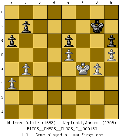 Last move : 1-0 2012 January 29 11:20:28 [Event "FICGS__CHESS__CLASS_C__000180"] [Site "FICGS"] [Date "2011.08.29"] [Round "1"] [White "Wilson,Jaimie"] [Black "Kepinski,Janusz"] [Result "1-0"] [WhiteElo "1653"] [BlackElo "1706"] 1.e4 e6 2.d4 d5 3.Nd2 Nf6 4.e5 Ne4 5.Nxe4 dxe4 6.Bc4 c5 7.c3 cxd4 8.Qxd4 Qxd4 9.cxd4 Bb4+ 10.Bd2 Bxd2+ 11.Kxd2 Bd7 12.Ne2 O-O 13.Ke3 Nc6 14.Ng3 Nb4 15.Rac1 Bc6 16.Nxe4 Rfd8 17.a3 Nd5+ 18.Bxd5 Bxd5 19.Rc5 Bc6 20.f3 Rd7 21.Nd6 Rad8 22.b4 a6 23.h4 h6 24.h5 Kh7 25.g4 f6 26.Rf1 fxe5 27.dxe5 Ba4 28.f4 Bc6 29.f5 Re7 30.f6 gxf6 31.Rxf6 Rg8 32.Rc4 Bb5 33.Rcf4 Be8 34.Nf7 Bxf7 35.Rxf7+ Rxf7 36.Rxf7+ Rg7 37.Rxg7+ Kxg7 38.Kf4 1-0 French : Tarrasch, Closed variation Kingside Castling by player Black (move 12) Player White won this chess game. Follow this game move after move (download)Chess is above all, a fight ! (Emanuel Lasker) Stil? Ich habe keinen Stil! (Anatoly Karpov) Una mala movida nulifica cuarenta buenas. (Horowitz) Seul un grand joueur sait à quel point il joue faiblement. (Xavier Tartacover) The ego is not master in its own house. (Sigmund Freud)