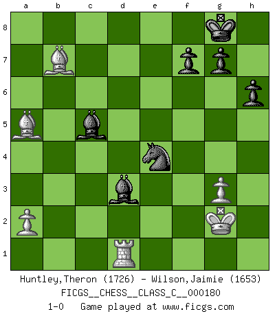 Last move : 1-0 2012 January 13 1:17:0 [Event "FICGS__CHESS__CLASS_C__000180"] [Site "FICGS"] [Date "2011.08.29"] [Round "1"] [White "Huntley,Theron"] [Black "Wilson,Jaimie"] [Result "1-0"] [WhiteElo "1726"] [BlackElo "1653"] 1.c4 e6 2.d4 d5 3.Nc3 c5 4.cxd5 exd5 5.Nf3 Nc6 6.g3 Nf6 7.Bg2 Be7 8.O-O O-O 9.Bg5 cxd4 10.Nxd4 h6 11.Be3 Bg4 12.Qa4 Ne5 13.Rfd1 Nc4 14.Bc1 Nb6 15.Qb3 Rc8 16.h3 Bd7 17.Bf4 Re8 18.Ndb5 a6 19.Nc7 Rxc7 20.Qxb6 Rxc3 21.Qxd8 Bxd8 22.bxc3 Rxe2 23.Bxd5 Bb6 24.Bxb7 Rxf2 25.Kh1 Bxh3 26.Rd2 Rxd2 27.Bxd2 a5 28.c4 Bf5 29.Kg2 Bd3 30.c5 Bxc5 31.Bxa5 Ne4 32.Rd1 1-0 English Opening Kingside Castling by player White (move 8) Kingside Castling by player Black (move 8) Player White won this chess game. Follow this game move after move (download)Personally, I rather look forward to a computer program winning the world Chess Championship. Humanity needs a lesson in humility. (Richard Dawkings) Wenn Du nicht kämpfst, um anderen etwas zu beweisen, sondern nur für Dich selbst, dann bist du fast unbesiegbar. (Garry Kasparov) Para mi, el Ajedrez es la vida y cada partida es como una nueva vida. Todo jugador de Ajedrez suele vivir muchas vidas durante su vida. (Eduard Gufeld) Lorsque vous vous retrouvez devant une position atroce, ne tendez pas un ultime piège dérisoire avec l'intention d'abandonner si l'adversaire le déjoue ! Faites-vous plutôt un devoir de résister comme si votre vie en dépendait. Jouez le coup qui vous déplairait au centuple si vous étiez dans la peau de votre tortionnaire ! Convictions are more dangerous enemies of truth than lies. (Friedrich Nietzsche)
