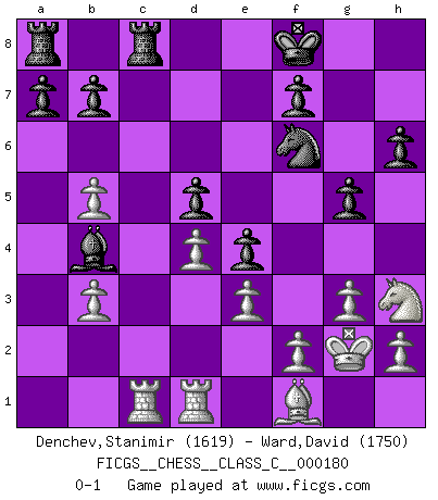 Last move : 0-1 2012 February 29 19:59:9 [Event "FICGS__CHESS__CLASS_C__000180"] [Site "FICGS"] [Date "2011.08.29"] [Round "1"] [White "Denchev,Stanimir"] [Black "Ward,David"] [Result "0-1"] [WhiteElo "1619"] [BlackElo "1750"] 1.d4 Nf6 2.Nf3 g6 3.g3 Bg7 4.Bg2 O-O 5.O-O d6 6.c4 c6 7.Nc3 Nbd7 8.Re1 e5 9.e3 e4 10.Ng5 d5 11.b3 Re8 12.Ba3 Nf8 13.Rc1 h6 14.Nh3 g5 15.cxd5 cxd5 16.Nb5 Qa5 17.Bxf8 Rxf8 18.a4 Bd7 19.Qe2 Bxb5 20.Qxb5 Qxb5 21.axb5 Rfc8 22.Bf1 Bf8 23.Kg2 Bb4 24.Red1 Kf8 0-1 King's Indian : Fianchetto without c4 Kingside Castling by player Black (move 4) Kingside Castling by player White (move 5) Player Black won this chess game. Follow this game move after move (download)Why must I lose to this idiot ? (Aron Nimzovich) Wenn Capablanka heute auf der Schachbühne erscheinen würde, hätte er ein halbes Jahr gebraucht um sich die Schachtheorie anzueignen. Und dann hätte er alles und jeden besiegt. (Mikhail Moiseyevich Botvinik) Del Ajedrez se ha dicho que la vida no es lo suficientemente larga para él, pero eso es culpa de la vida, no del Ajedrez. (William Ewart Napier) Le système Elo représente seulement une moyenne. Il est simplement un indicateur de votre stabilité. (Anatoli Karpov) The ultimate in disposing one's troops is to be without ascertainable shape. Then the most penetrating spies cannot pry in nor can the wise lay plans against you. (Sun Tzu)
