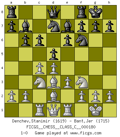 Last move : 1-0 2011 October 26 0:49:13 [Event "FICGS__CHESS__CLASS_C__000180"] [Site "FICGS"] [Date "2011.08.29"] [Round "1"] [White "Denchev,Stanimir"] [Black "Bant,Jer"] [Result "1-0"] [WhiteElo "1619"] [BlackElo "1715"] 1.Nf3 d5 2.d4 Nf6 3.c4 e6 4.Nc3 c6 5.e3 Be7 6.Bd2 O-O 7.Rc1 Nbd7 8.Bd3 b6 9.O-O Bb7 10.Re1 1-0 This chess game has been lost on time (started : 2011.08.29 12:9:33) Reti Opening Kingside Castling by player Black (move 6) Kingside Castling by player White (move 9) Player White won this chess game. Follow this game move after move (download)The hallmark of the artist is simplicity. (Larry Evans) Ja, jede Frau in Holland liebt mich bestimmt, und alle Männer hassen mich. (Loek van Wely) El Ajedrez es despiadado: debes de estar preparado para matar gente. (Nigel Short) Les échecs sont plus proches de l'art de l'assassinat que de l'art de la guerre. (Arturo Perez-Reverte) Who needs drugs and alcohol if he can play Big Chess at FICGS ? (Heinz-Georg Lehnhoff)
