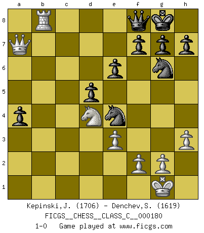 Last move : 1-0 2011 October 24 9:21:26 [Event "FICGS__CHESS__CLASS_C__000180"] [Site "FICGS"] [Date "2011.08.29"] [Round "1"] [White "Kepinski,Janusz"] [Black "Denchev,Stanimir"] [Result "1-0"] [WhiteElo "1706"] [BlackElo "1619"] 1.d4 d5 2.c4 c6 3.e3 Nf6 4.Nf3 e6 5.Be2 Be7 6.O-O O-O 7.Nc3 Nbd7 8.Re1 Re8 9.a4 Nf8 10.h3 Ng6 11.c5 b6 12.b4 a5 13.Ba3 axb4 14.Bxb4 bxc5 15.Bxc5 Bxc5 16.dxc5 Qa5 17.Qc2 Qxc5 18.Rec1 Ba6 19.Bxa6 Rxa6 20.Nd4 Rc8 21.Rab1 Ra7 22.Qb3 Qf8 23.Qb6 Rac7 24.Ncb5 cxb5 25.Rxc7 Rxc7 26.Qxc7 bxa4 27.Qa7 Ne4 28.Rb8 1-0 QGD Slav defense Kingside Castling by player White (move 6) Kingside Castling by player Black (move 6) Player White won this chess game. Follow this game move after move (download)Spassky will not be psyched out by Fischer. (Mike Goodall) Die Leute spielen gegen mich seit 15 Jahren unter Ihren Möglichkeiten. (Robert James Fischer) Si el ingenio solamente fuese necesario para lucirse, las mujeres serían las mejores jugadoras de Ajedrez del mundo. (Albin) On entre au jeu d'Echecs comme on entre en Religion. Pour le joueur d'Echecs, la partie d'Echecs c'est l'office, la messe, le défilé du 1er Mai, le dépôt de gerbe au Monument aux Morts. C'est un drame sacré. (Michel Roos) The problem with troubleshooting is that trouble shoots back. (Anonymous)