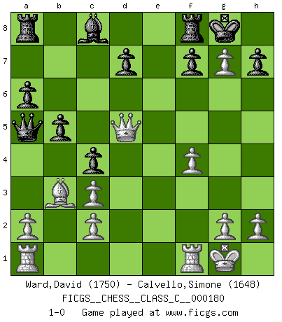 Last move : 1-0 2011 December 16 16:34:29 [Event "FICGS__CHESS__CLASS_C__000180"] [Site "FICGS"] [Date "2011.08.29"] [Round "1"] [White "Ward,David"] [Black "Calvello,Simone"] [Result "1-0"] [WhiteElo "1750"] [BlackElo "1648"] 1.e4 e5 2.Nf3 Nc6 3.Bb5 a6 4.Ba4 Nf6 5.Nc3 b5 6.Bb3 Bc5 7.Nxe5 Nxe5 8.d4 Bd6 9.dxe5 Bxe5 10.f4 Bxc3+ 11.bxc3 O-O 12.e5 c5 13.Ba3 Qa5 14.O-O Qxa3 15.exf6 c4 16.Qd5 Qa5 17.fxg7 1-0 Ruy Lopez : Four knights (Tarrasch) variation Kingside Castling by player Black (move 11) Kingside Castling by player White (move 14) Player White won this chess game. Follow this game move after move (download)Life is a kind of Chess, with struggle, competition, good and ill events. (Benjamin Franklin) Im Hotelzimmer gab es nur zwei Schaben. (Über die Turnierbedingungen) (Peter Swidler) Todos los Maestros de Ajedrez fueron un día unos principiantes. (Chernev) Je ne suis pas le dernier à jouer lâchement des coups douteux pendant le zeïtnot de l'adversaire pour l'achever: en effet les coups qui font le plus peur sont ceux que l'on ne comprend pas. Je me fais souvent peur quand je joue. (Un professeur anonyme) Thibault, I ask for draw. Game 13876. - Sorry Ilmars, you won. (FICGS chat)