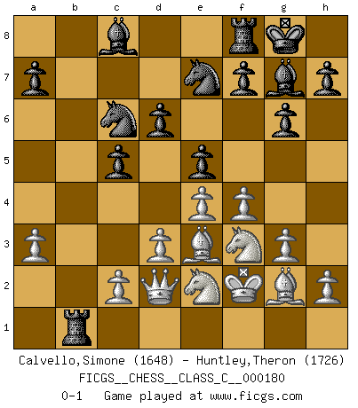 Last move : 0-1 2011 December 7 3:31:2 [Event "FICGS__CHESS__CLASS_C__000180"] [Site "FICGS"] [Date "2011.08.29"] [Round "1"] [White "Calvello,Simone"] [Black "Huntley,Theron"] [Result "0-1"] [WhiteElo "1648"] [BlackElo "1726"] 1.e4 c5 2.Nc3 g6 3.g3 Nc6 4.Bg2 Bg7 5.d3 d6 6.f4 e6 7.Nf3 Nge7 8.O-O O-O 9.Be3 Rb8 10.Rb1 b5 11.Qd2 b4 12.Ne2 Qb6 13.a3 bxa3 14.bxa3 Qxb1 15.Rxb1 Rxb1+ 16.Kf2 e5 0-1 Sicilian : Closed Kingside Castling by player White (move 8) Kingside Castling by player Black (move 8) Player Black won this chess game. Follow this game move after move (download)Everything is in a state of flux, and this includes the world of Chess. (Mikhail Botvinnik) Die jungen Leute sollen verstehen, dass sie noch etwas von mir lernen können und müssen. (Viktor Kortschnoi) En manos de Fischer's, una diminuta ventaja teórica es tan buena como tener una Reina de ventaja. (Isaac Kashdan) Le jeu d'échecs est comme rejeté hors du temps. (Antoine de Saint-Exupéry) O divine art of subtlety and secrecy! Through you we learn to be invisible, through you inaudible and hence we can hold the enemy's fate in our hands. (Sun Tzu)