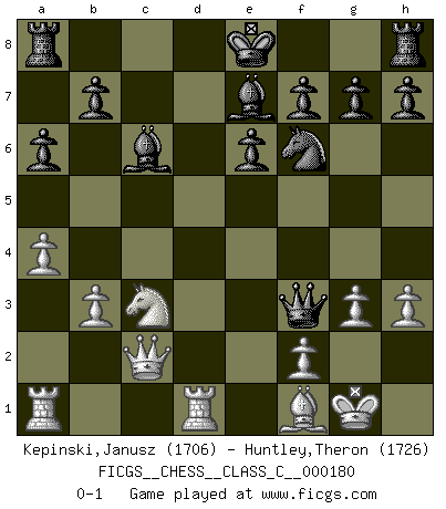 Last move : 0-1 2011 September 5 13:19:10 [Event "FICGS__CHESS__CLASS_C__000180"] [Site "FICGS"] [Date "2011.08.29"] [Round "1"] [White "Kepinski,Janusz"] [Black "Huntley,Theron"] [Result "0-1"] [WhiteElo "1706"] [BlackElo "1726"] 1.d4 Nf6 2.c4 e6 3.Nf3 d5 4.e3 dxc4 5.Bxc4 c5 6.O-O a6 7.a4 Nc6 8.Qc2 cxd4 9.exd4 Be7 10.Bg5 Nxd4 11.Nxd4 Qxd4 12.Rd1 Qc5 13.b3 Qxg5 14.Nc3 Bd7 15.h3 Bc6 16.g3 Qh5 17.Bf1 Qf3 0-1 Queen's pawn game Kingside Castling by player White (move 6) Player Black won this chess game. Follow this game move after move (download)I love all positions. Give me a difficult positional game, I will play it. But totally won positions, I cannot stand them. (Hein Donner) Kritik überlasse ich den Spießern. Ich zeige nichts, wofür ich mich schämen muss. (Alexandra Kosteniuk) Alguna parte de un error es siempre correcto. (Savielly Tartakover) Aux échecs, les retours au sommet sont rares : les dommages psychologiques consécutifs à une défaite sont trop sévères. (Daily Telegraph) Work expands to fill the time available. (C. Northcote Parkinson, in Parkinson's Laws)