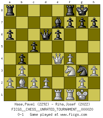 Last move : 0-1 2011 September 5 11:36:6 [Event "FICGS__CHESS__UNRATED_TOURNAMENT__000020"] [Site "FICGS"] [Date "2011.08.30"] [Round "1"] [White "Hase,Pavel"] [Black "Riha,Josef"] [Result "0-1"] [WhiteElo "2292"] [BlackElo "2022"] 1.e4 c5 2.b3 d6 3.Bb2 Nc6 4.f4 e6 5.Nf3 Nf6 6.Nc3 Be7 7.Bb5 Bd7 8.O-O O-O 9.h3 a6 10.Bxc6 Bxc6 11.Qe2 b5 12.Rae1 b4 13.e5 Nh5 14.exd6 Qxd6 15.Ne4 Bxe4 16.Qxe4 Ng3 0-1 Sicilian defense Kingside Castling by player White (move 8) Kingside Castling by player Black (move 8) Player Black won this chess game. Follow this game move after move (download)If cunning alone were needed to excel, women would be the best Chess players. (Albin) Ich weiss nicht was Gott gegen mich auf 1.e4 antworten würde. (Robert James Fischer) Puntos débiles o agujeros en la posición de tu oponente deben de ser ocupados por piezas, no Peones. (Siegbert Tarrasch) Assurément je connaissais par expérience le mystérieux attrait de ce jeu royal, le seul entre tous les jeux inventés par les hommes qui échappe souverainement à la tyrannie du hasard, le seul où l'on ne doive sa victoire qu'à son intelligence ou plutôt à une certaine forme d'intelligence. Mais n'est-ce pas déjà le limiter injurieusement que d'appeler les échecs un jeu ? N'est-ce pas une science, un art ou quelque chose qui, comme le cercueil de Mahomet entre ciel et terre, est suspendu entre l'un et l'autre, et qui réunit un nombre incroyable de contraires ? [...] C'est une pensée qui ne mène à rien, une mathématique qui n'établit rien, un art qui ne laisse pas d'uvre, une architecture sans matière; et il l'a prouvé néanmoins qu'il était plus durable, à sa manière, que les livres ou que tout autre monument, ce jeu unique qui appartient à tous les peuples et à tous les temps, et dont personne ne sait quel dieu en fit don à la terre pour tuer l'ennui, pour aiguiser l'esprit et stimuler l'âme. Où commence-t-il, où finit-il ? (Stefan Zweig) Internet: Absolute communication, absolute isolation. (Paul Carvel)