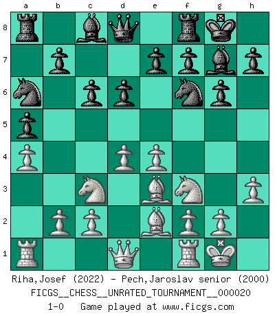 Last move : 1-0 2011 November 24 1:29:58 [Event "FICGS__CHESS__UNRATED_TOURNAMENT__000020"] [Site "FICGS"] [Date "2011.08.30"] [Round "1"] [White "Riha,Josef"] [Black "Pech,Jaroslav senior"] [Result "1-0"] [WhiteElo "2022"] [BlackElo "2000"] 1.e4 d6 2.d4 Nf6 3.Nc3 g6 4.Nf3 Bg7 5.Be2 O-O 6.O-O c6 7.a4 a5 8.h3 Na6 9.Be3 1-0 This chess game has been lost on time (started : 2011.08.30 2:32:37) Pirc : Classical system, 5.Be2 Kingside Castling by player Black (move 5) Kingside Castling by player White (move 6) Player White won this chess game. Follow this game move after move (download)Don't even mention losing to me. I can't stand to think of it. (Bobby Fischer) Ich habe kein Problem mit Frauen, sondern nur mit dem Niveau ihres Schachspiels (Judith Polgar) El Ajedrez es una guerra en un tablero. El objetivo es aplastar la mente del oponente. (Bobby Fischer) Donnez-moi un Cavalier en 6e et je gagnerais toutes mes parties. (Steinitz) Any activity becomes creative when the doer cares about doing it right or doing it better. (John Updike)