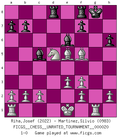 Last move : 1-0 2011 September 27 13:0:56 [Event "FICGS__CHESS__UNRATED_TOURNAMENT__000020"] [Site "FICGS"] [Date "2011.08.30"] [Round "1"] [White "Riha,Josef"] [Black "Martinez,Silvio"] [Result "1-0"] [WhiteElo "2022"] [BlackElo "0983"] 1.Nf3 Nc6 2.d4 d5 3.Bf4 Nf6 4.e3 e6 5.Bd3 Bd6 6.Ne5 Nxe5 7.dxe5 Bc5 8.exf6 Qxf6 9.Nc3 O-O 10.Bxc7 e5 11.Nxd5 Qe6 12.Qf3 Qc6 13.Bxe5 h6 14.Nc7 Qxf3 15.gxf3 Rb8 16.Nd5 Be6 17.Rg1 g6 18.Bxg6 Rbd8 19.Bf5 1-0 Reti Opening Kingside Castling by player Black (move 9) Player White won this chess game. Follow this game move after move (download)Chess is the gymnasium of the mind. (Blaise Pascal) Ich habe Kasparov in Rente geschickt. (Veselin Topalov) Todos los Maestros de Ajedrez fueron un día unos principiantes. (Chernev) Psychologiquement, tu dois avoir confiance en toi même, mais cette confiance doit être basée sur des faits. (Robert Fischer) Do you know these so called Volunteers don't even get paid! (Simpsons)