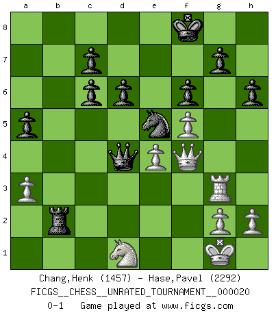 Last move : 0-1 2011 December 18 15:3:54 [Event "FICGS__CHESS__UNRATED_TOURNAMENT__000020"] [Site "FICGS"] [Date "2011.08.30"] [Round "1"] [White "Chang,Henk"] [Black "Hase,Pavel"] [Result "0-1"] [WhiteElo "1457"] [BlackElo "2292"] 1.c4 e5 2.Nc3 Nf6 3.Nf3 Nc6 4.d4 exd4 5.Nxd4 Be7 6.e4 d6 7.Be3 O-O 8.Be2 Re8 9.O-O Bf8 10.f3 a6 11.Nxc6 bxc6 12.Bg5 Be7 13.a3 Be6 14.Qe1 a5 15.Rd1 Nd7 16.Bxe7 Qxe7 17.f4 f6 18.Qg3 Reb8 19.Rd2 Qf7 20.f5 Bxc4 21.Bxc4 Qxc4 22.Rf4 Ne5 23.Rh4 Qf7 24.Rf2 Rb3 25.Qh3 h6 26.Qg3 Kf8 27.Rh3 Rab8 28.Qf4 Rxb2 29.Rxb2 Rxb2 30.Rg3 Qc4 31.Nd1 Qd4+ 0-1 English Opening Kingside Castling by player Black (move 7) Kingside Castling by player White (move 9) Player Black won this chess game. Follow this game move after move (download)Methodical thinking is of more use in Chess than inspiration. (C. J. S. Purdy) Bogoljubow: Matt in vier Zügen! Tartakower: Ich verbitte mir jede Belästigung! (Savielly Grigorievitsch Tartakower) a manera como él juega al Ajedrez, demuestra la completa naturaleza de un hombre. (Stanley Ellin) Vouloir jouer aux échecs contre soi-même est aussi paradoxal que vouloir marcher sur son ombre. (Stefan Zweig) Dave, my mind is going. I can feel it. (HAL 9000 in 2001, a space odyssey)
