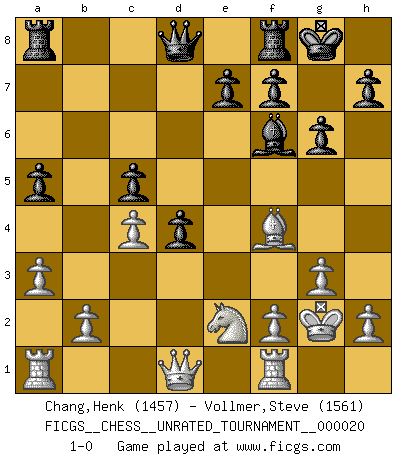 Last move : 1-0 2012 January 2 17:35:4 [Event "FICGS__CHESS__UNRATED_TOURNAMENT__000020"] [Site "FICGS"] [Date "2011.08.30"] [Round "1"] [White "Chang,Henk"] [Black "Vollmer,Steve"] [Result "1-0"] [WhiteElo "1457"] [BlackElo "1561"] 1.Nf3 c5 2.g3 d5 3.Bg2 Nf6 4.O-O g6 5.d4 cxd4 6.Nxd4 Bg7 7.c4 Nc6 8.Nxc6 bxc6 9.Nc3 Bb7 10.e4 d4 11.Ne2 c5 12.Bf4 O-O 13.a3 a5 14.e5 Bxg2 15.exf6 Bxf6 16.Kxg2 1-0 This chess game has been lost on time (started : 2011.08.30 2:32:37) Reti Opening Kingside Castling by player White (move 4) Kingside Castling by player Black (move 12) Player White won this chess game. Follow this game move after move (download)Chess is thirty to forty percent psychology. You don't have this when you play a computer. I can't confuse it. (Judith Polgar) Das Blackmar-Diemer-Gambit verändert den ganzen Menschen! (Emil Joseph Diemer) A la fecha, Fischer esta simplemente un nivel arriba de todos los mejores jugadores de Ajedrez del mundo. (John Jacobs) Toute estimation doit être constamment réévaluée. (Jacob Estrin) A good teacher is like a candle - it consumes itself to light the way for others. (Author unknown)
