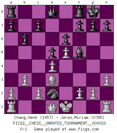 Last move : 0-1 2011 December 4 3:22:13 [Event "FICGS__CHESS__UNRATED_TOURNAMENT__000020"] [Site "FICGS"] [Date "2011.08.30"] [Round "1"] [White "Chang,Henk"] [Black "Jerez,Miriam"] [Result "0-1"] [WhiteElo "1457"] [BlackElo "0785"] 1.d4 d5 2.Nf3 Nf6 3.b3 Nc6 4.Bb2 Bf5 5.h3 e6 6.Ne5 Nxe5 7.dxe5 Ne4 8.Nd2 Bc5 9.e3 O-O 10.Bd4 Bxd4 11.exd4 b6 12.Bd3 Nxd2 0-1 This chess game has been lost on time (started : 2011.08.30 2:32:37) Queen's pawn game Kingside Castling by player Black (move 9) Player Black won this chess game. Follow this game move after move (download)Of Chess it has been said that life is not long enough for it, but that is the fault of life, not Chess. (William Ewart Napier) Ich kenne Menschen, die allen Willen der Welt besitzen und doch nicht Schach spielen können. (Robert James Fischer) Robert Fischer es la ley hacia si mismo. (Larry Evans) Le succès, c'est être capable d'aller d'échec en échec sans perdre son enthousiasme. (Winston Churchill) The only thing that matters is the evidence. (Horatio Caine, C.S.I. Miami)