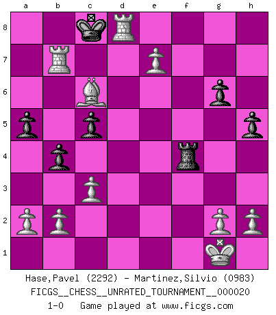 Last move : 1-0 2011 November 14 14:1:7 [Event "FICGS__CHESS__UNRATED_TOURNAMENT__000020"] [Site "FICGS"] [Date "2011.08.30"] [Round "1"] [White "Hase,Pavel"] [Black "Martinez,Silvio"] [Result "1-0"] [WhiteElo "2292"] [BlackElo "0983"] 1.e4 e5 2.Nf3 Nc6 3.Bb5 Nge7 4.d4 exd4 5.O-O a6 6.Ba4 b5 7.Bb3 Ng6 8.Nxd4 Bc5 9.Nxc6 dxc6 10.Qxd8+ Kxd8 11.Bxf7 Ne5 12.Bg5+ Be7 13.Rd1+ Bd7 14.Bxe7+ Kxe7 15.Bh5 g6 16.Be2 c5 17.Nc3 b4 18.Nd5+ Kd8 19.Nf6 a5 20.f4 Nc6 21.Rxd7+ Kc8 22.Bg4 Kb7 23.Nd5 Ka6 24.Nxc7+ Ka7 25.Nxa8 Kxa8 26.c3 h5 27.Bf3 Nb8 28.e5 Nc6 29.Bxc6+ Kb8 30.Rad1 Rf8 31.e6 Kc8 32.Ra7 Rxf4 33.e7 Kb8 34.Rb7+ Kc8 35.Rd8+ 1-0 Ruy Lopez : Cozio defense Kingside Castling by player White (move 5) Player White won this chess game. Follow this game move after move (download)Chess is a part of culture and if a culture is declining then Chess too will decline. (Mikhail Botvinnik) Ich würde mich als ganz normalen Jungen bezeichnen [Im Alter von 12]. (Sergej Karjakin) Para mi, el Ajedrez es la vida y cada partida es como una nueva vida. Todo jugador de Ajedrez suele vivir muchas vidas durante su vida. (Eduard Gufeld) Tous ces prétendus hommes politiques sont les pions, les Cavaliers, les Tours ou les Fous d'une partie d'échecs qui se jouera tant qu'un hasard ne renversera pas l'échiquier. (Honoré de Balzac) I'll be back. (Arnold Schwarzenegger)
