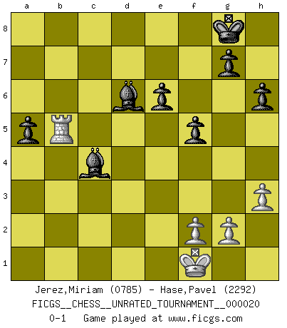 Last move : 0-1 2011 November 4 0:47:13 [Event "FICGS__CHESS__UNRATED_TOURNAMENT__000020"] [Site "FICGS"] [Date "2011.08.30"] [Round "1"] [White "Jerez,Miriam"] [Black "Hase,Pavel"] [Result "0-1"] [WhiteElo "0785"] [BlackElo "2292"] 1.e4 d6 2.Nf3 c5 3.Bc4 e6 4.O-O a6 5.Nc3 b5 6.Be2 Nd7 7.d4 Bb7 8.dxc5 Nxc5 9.b4 Nxe4 10.Nxe4 Bxe4 11.Bb2 Nf6 12.Ng5 Bd5 13.h3 h6 14.Bxf6 Qxf6 15.Nf3 Be7 16.Rc1 Bxa2 17.c3 Bd5 18.Re1 O-O 19.Qd3 Rfc8 20.Qd4 Rc7 21.Qxf6 Bxf6 22.Nd2 Rxc3 23.Rxc3 Bxc3 24.Rd1 Bxb4 25.Bd3 Rc8 26.Ne4 a5 27.Rb1 f5 28.Nxd6 Bxd6 29.Rxb5 Rc1+ 30.Bf1 Rxf1+ 31.Kxf1 Bc4+ 0-1 King's pawn Opening Kingside Castling by player White (move 4) Kingside Castling by player Black (move 18) Player Black won this chess game. Follow this game move after move (download)When you see a good move, look for a better one. (Emanuel Lasker) Wenn Capablanka heute auf der Schachbühne erscheinen würde, hätte er ein halbes Jahr gebraucht um sich die Schachtheorie anzueignen. Und dann hätte er alles und jeden besiegt. (Mikhail Moiseyevich Botvinik) La vida es como un juego de Ajedrez, cambiando con cada movimiento. (Proverbio Chino) Roi des jeux et jeu des rois, les échecs portent en eux un sentiment d'infini. Ils donnent à celui qui s'est efforcé d'en approfondir les arcanes l'impression de n'être pas à la mesure de l'homme; en fait, ils constituent un résumé de l'univers, un microcosme, et figurent cette grande échelle qui, dans les plans de la lumière descend jusqu'à la matière, qui des abîmes insondables remonte jusqu'en l'infini de Dieu. (Pyrame) It's not a bug - it's an undocumented feature. (Anonymous)